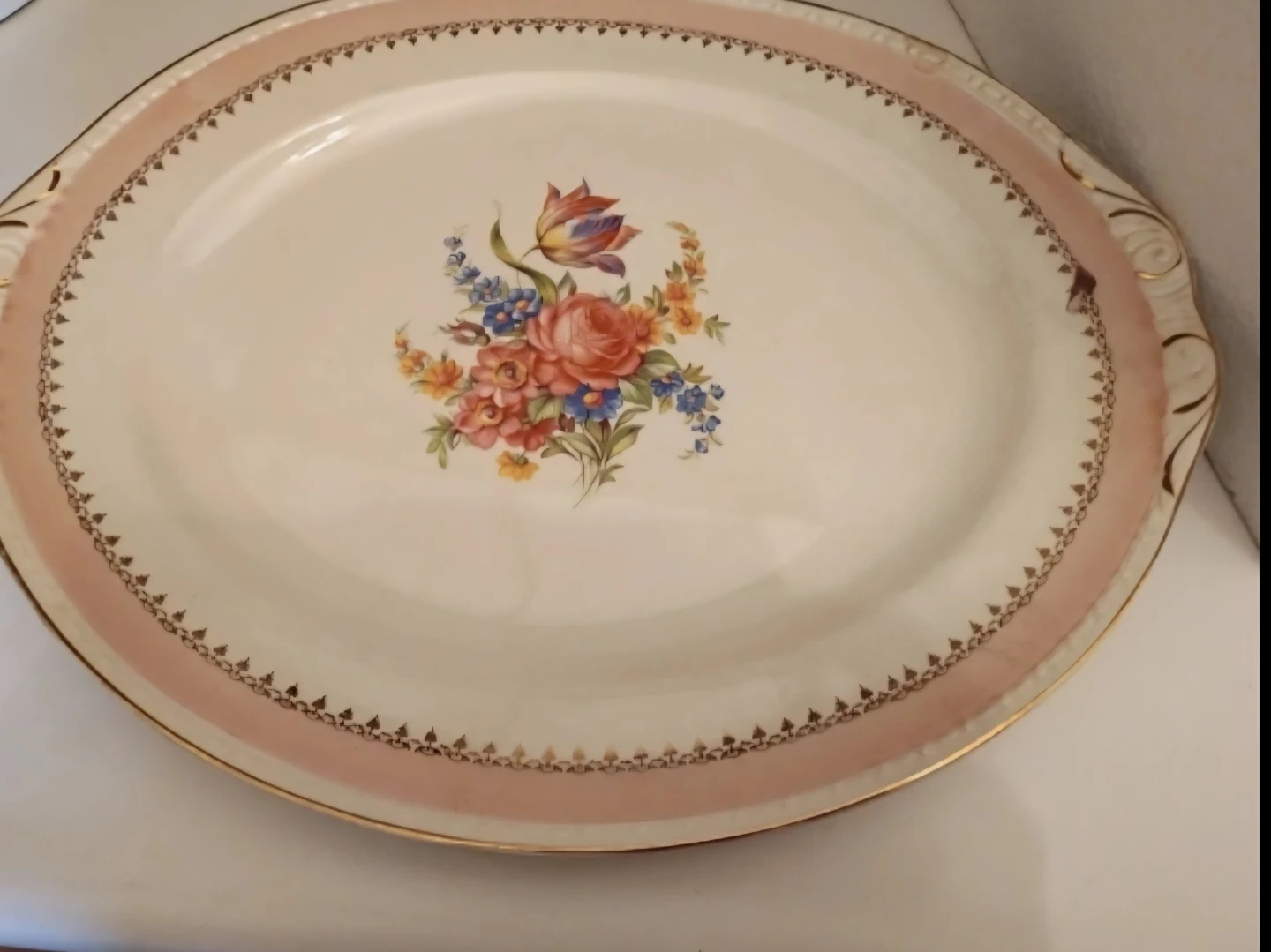 BEAUTIFUL VINTAGE SERVING PLATTER FLORAL DESIGN. PINK BORDER.