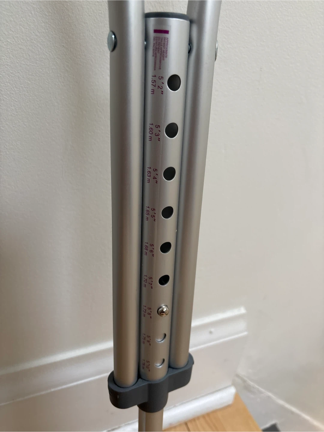 Selling a pair of adjustable aluminum crutches. They are in good condition and ready to assist someone in need. The height is adjustable, as shown in the pictures. Covers heights 5’2” to 5’10”.