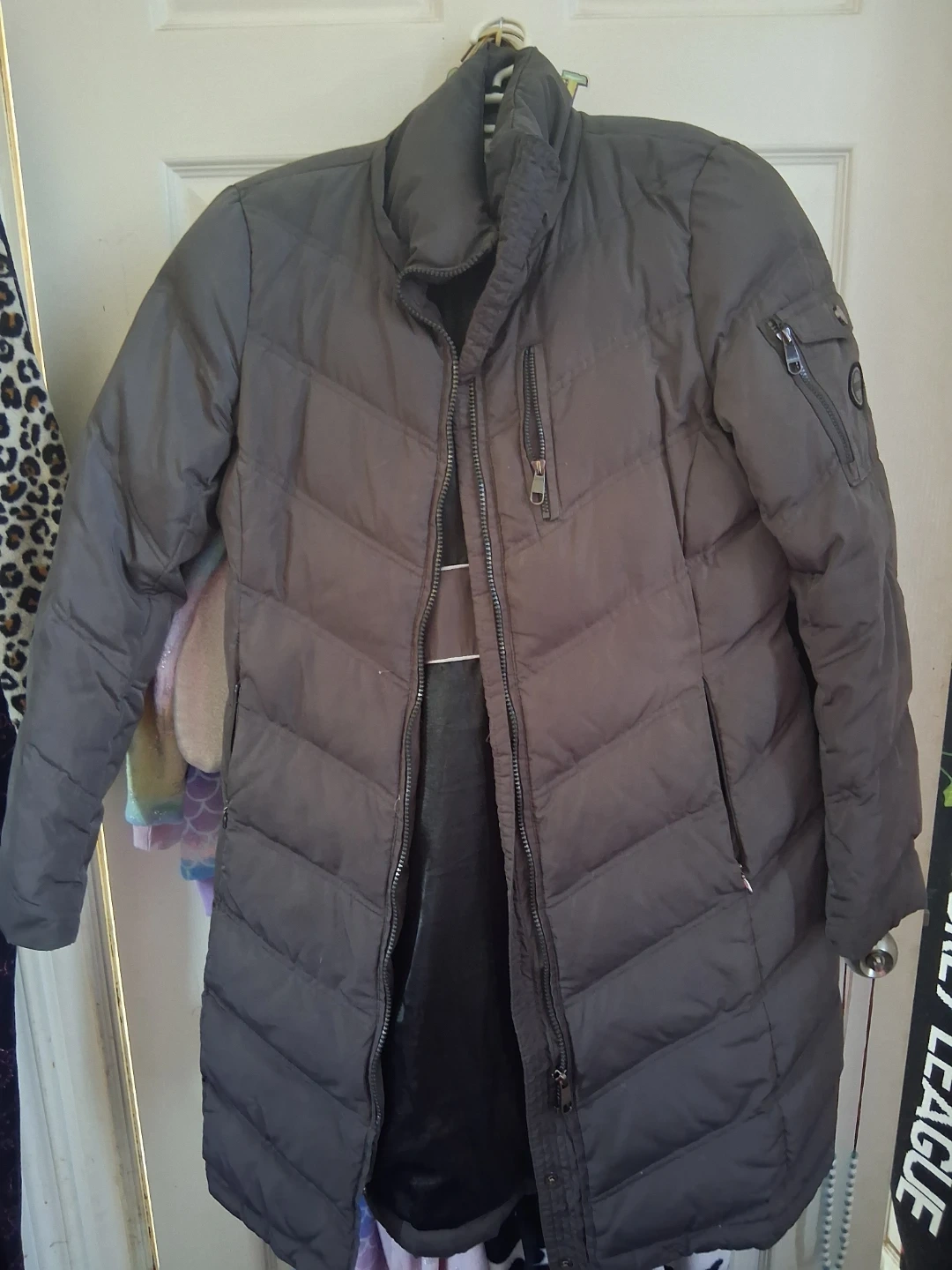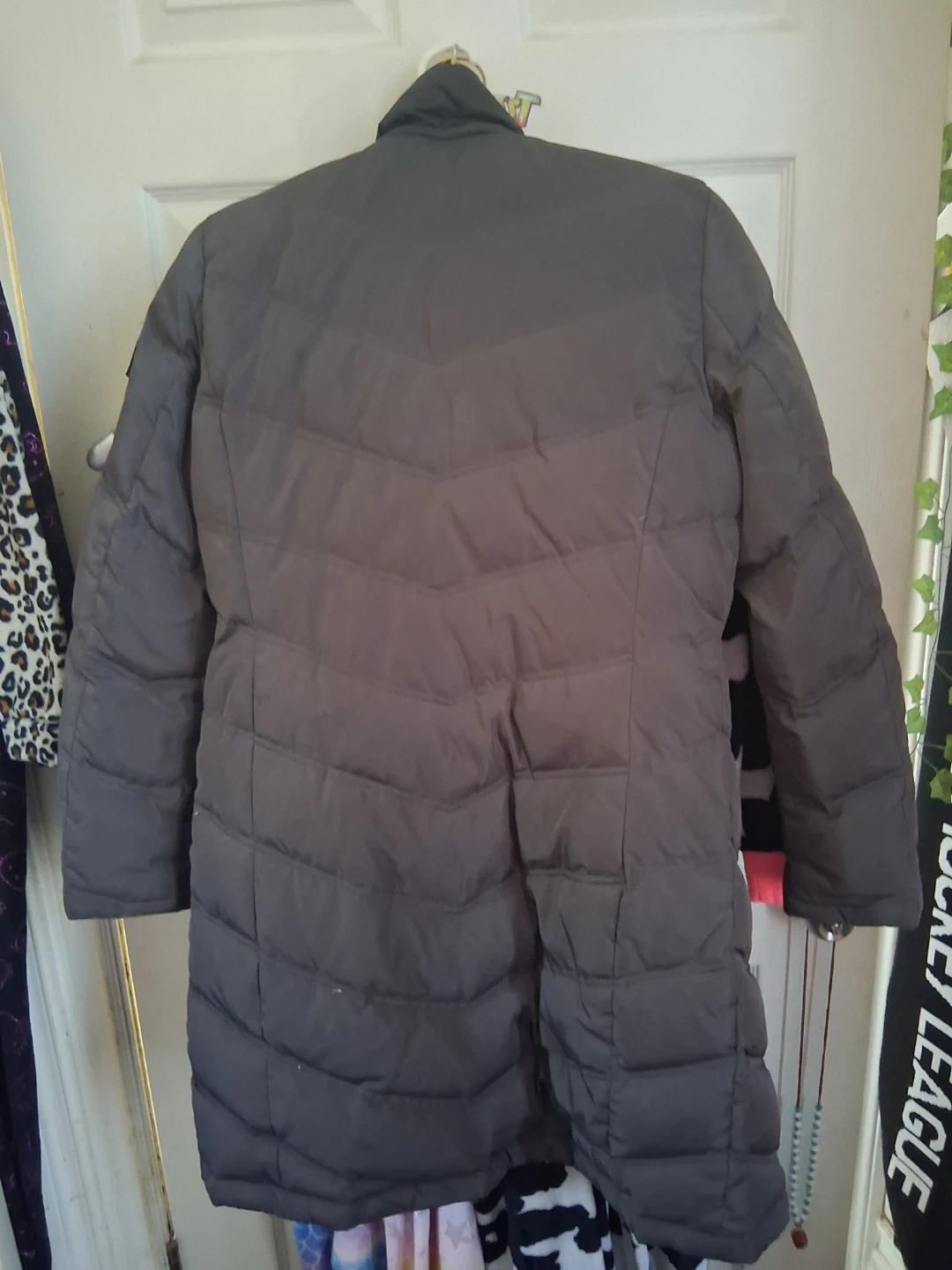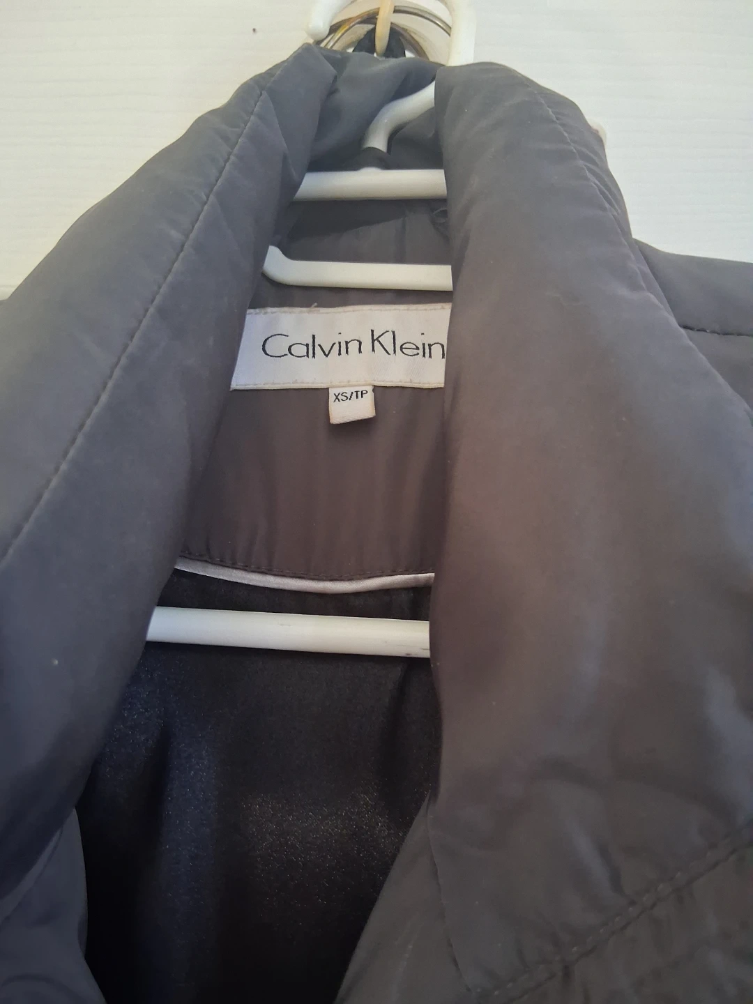 I'm selling a Calvin Klein puffer coat in size XS/TP. It's a stylish and warm option for colder weather. The coat is grey and features a quilted design. It's in great condition and ready for a new owner!