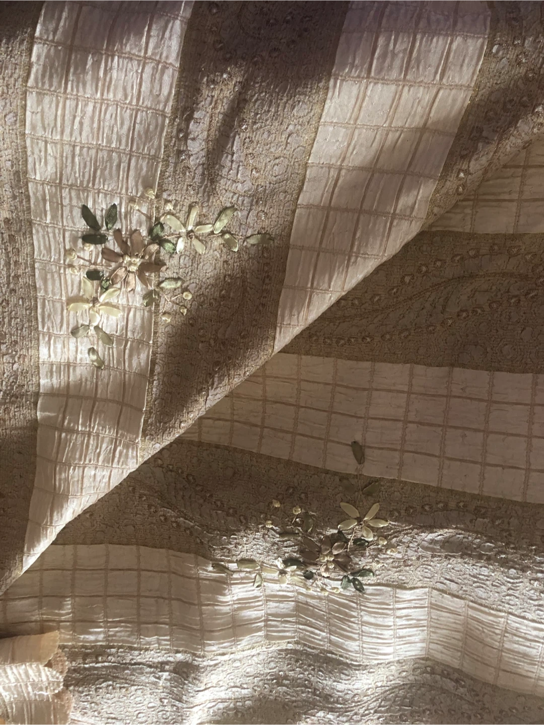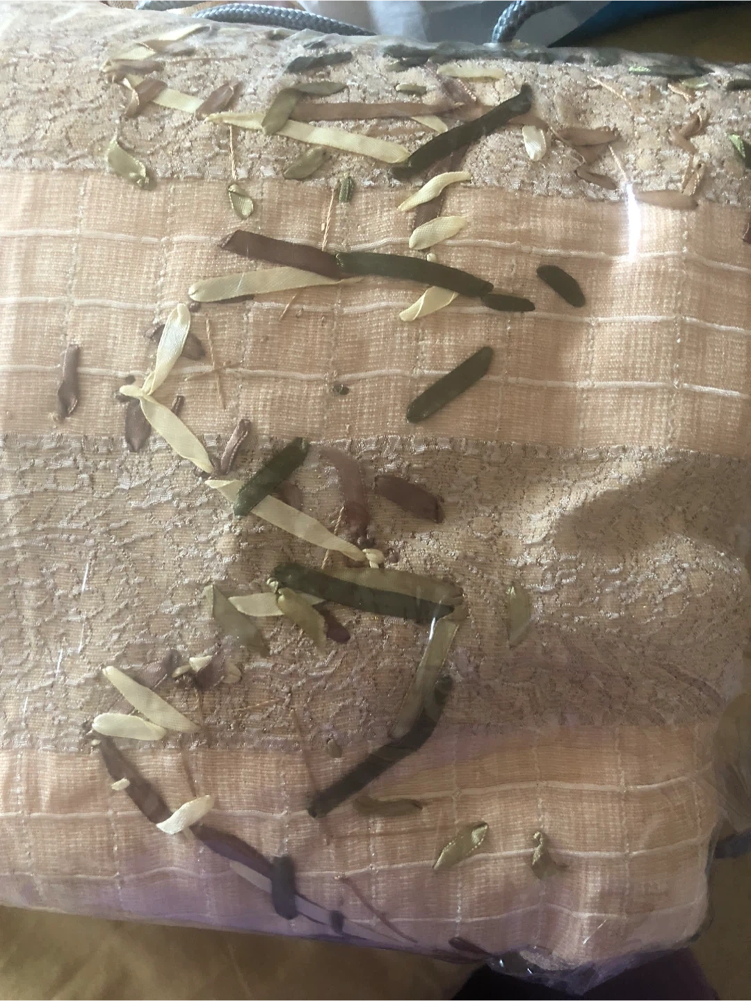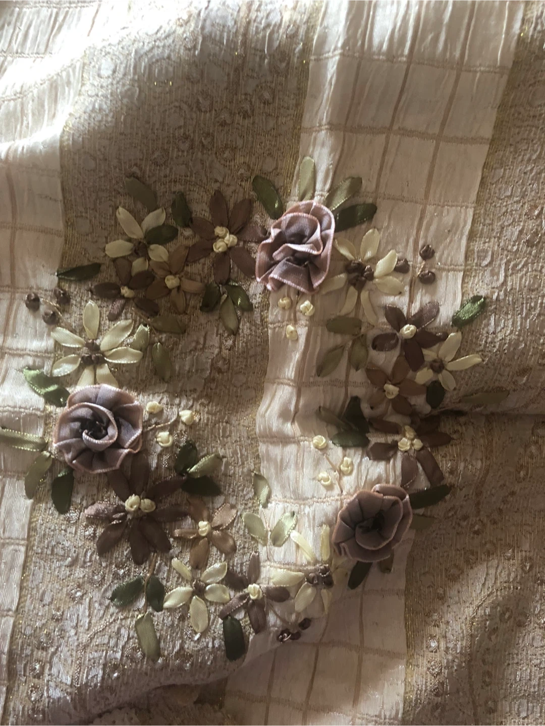Selling a beautiful beige clr Queen bed set with intricate floral ribbons embroidery. striped pattern with delicate ribbon flowers and leaves in neutral tones.with 2 pillowcases and two cushions cover