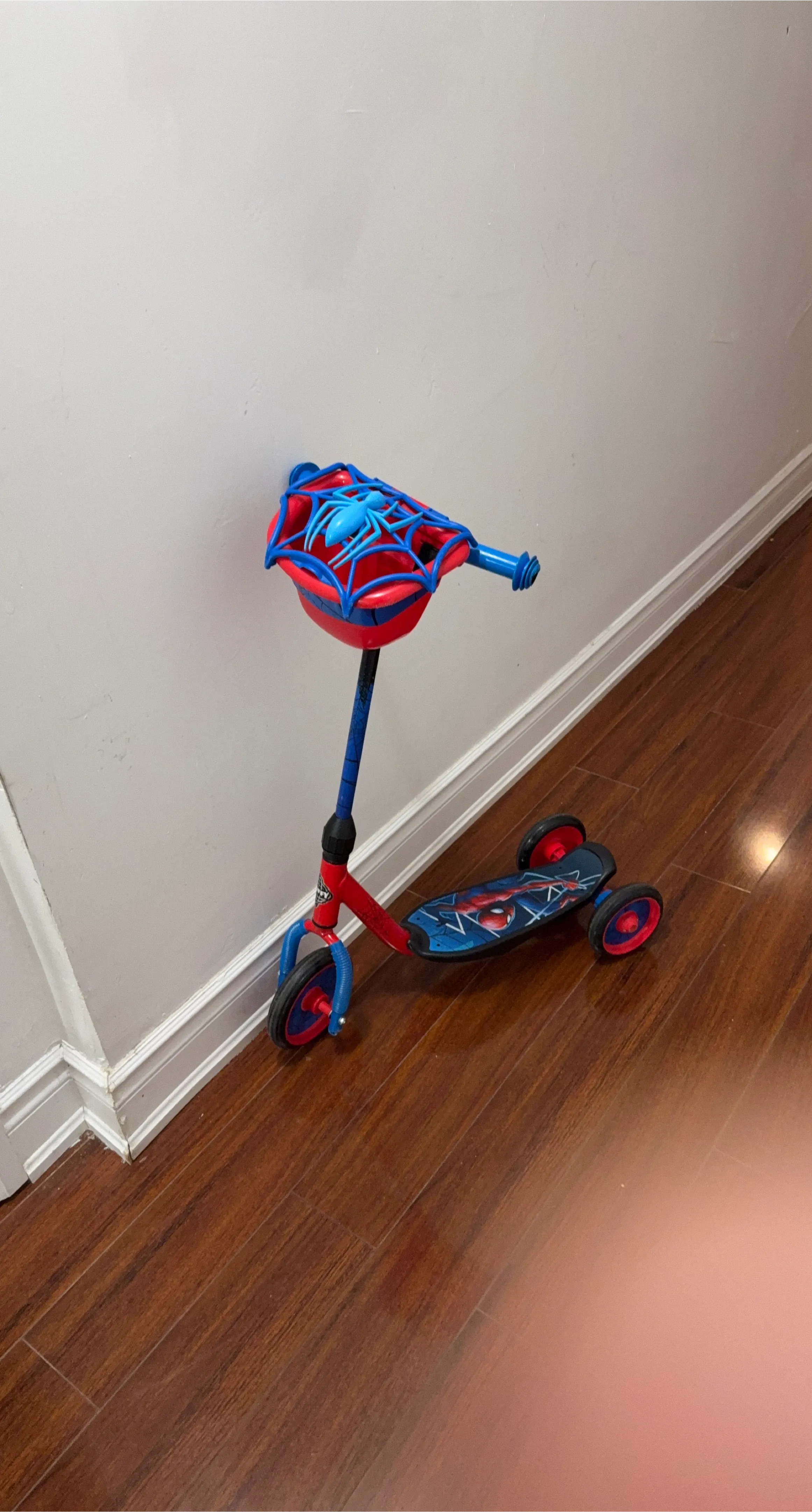 Here's a fun Spiderman themed scooter! It has three wheels for extra stability, perfect for young kids learning to scoot around. The colours are bright and vibrant, and it's in great condition for many more adventures