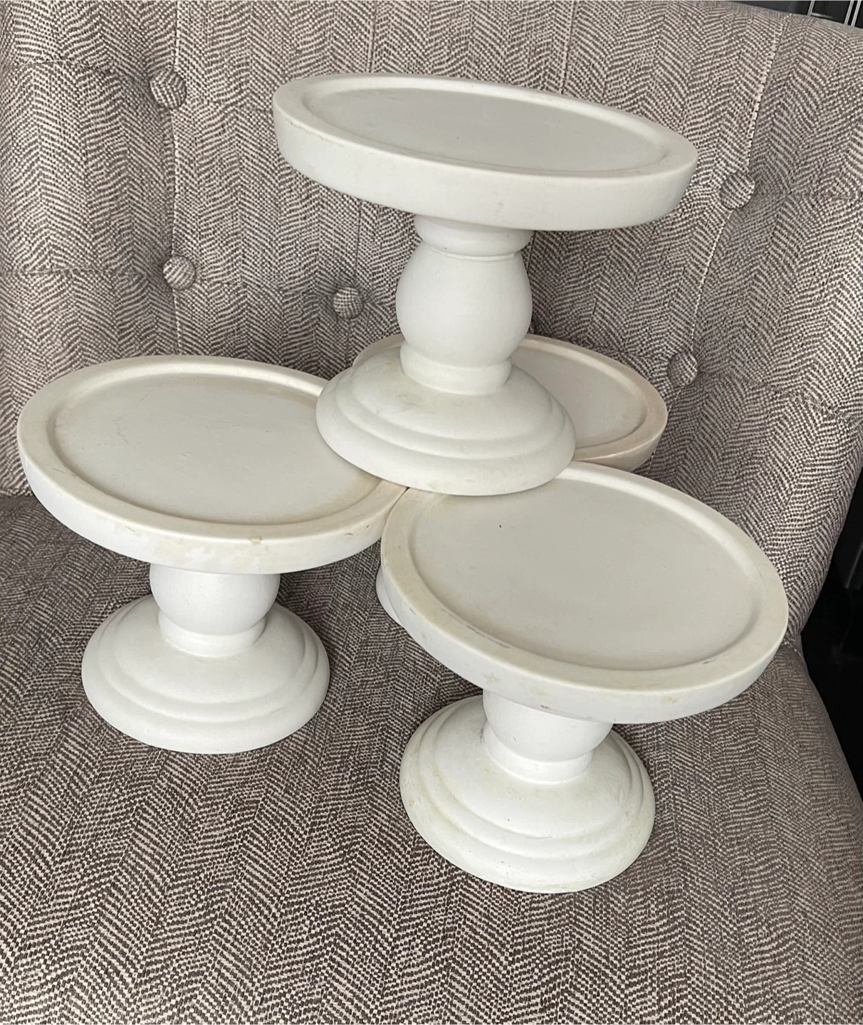 I'm selling these 4 lovely white pedestal stands! They're perfect for displaying as risers plants, or anything else you'd like to showcase. They add a touch of elegance to any setting. They are in great condition and ready for a new home!