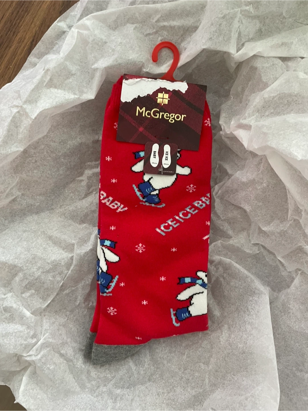 Cozy McGregor socks, perfect for keeping your feet warm! These are a size 6-9.5, and feature a fun "Ice Baby" design with polar bears on a red background