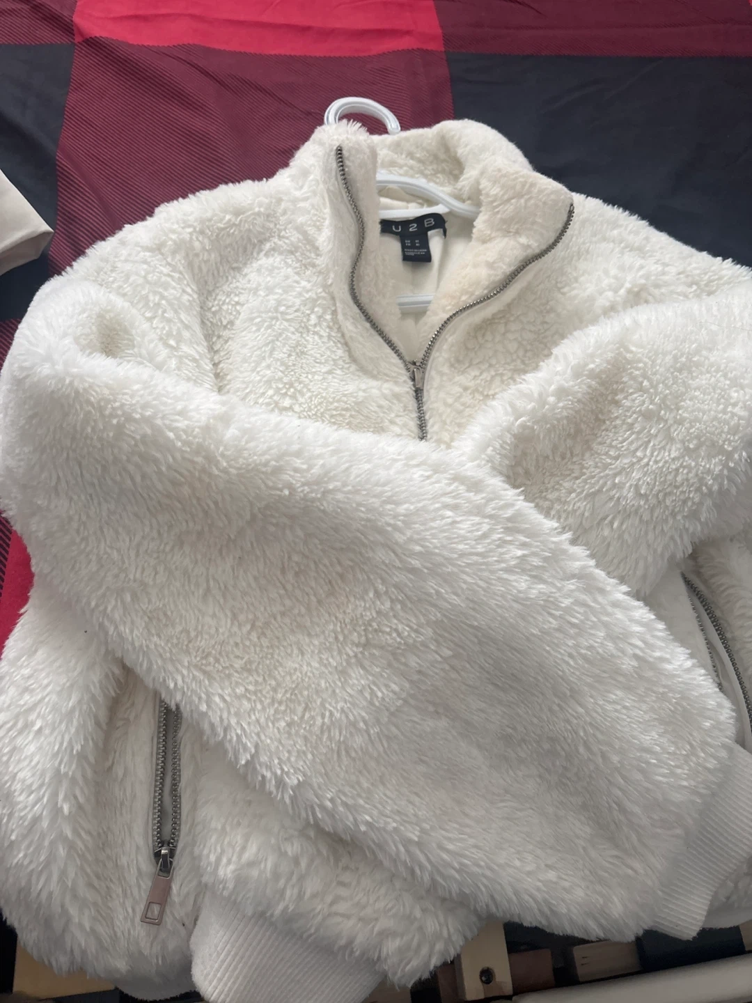 Selling a super cozy white fleece jacket from U2B! It's in great condition and perfect for staying warm and stylish during the cooler months. The soft, fluffy material is so comfy to wear. It features a full zipper and side pockets with zippers as well. A great addition to any wardrobe!