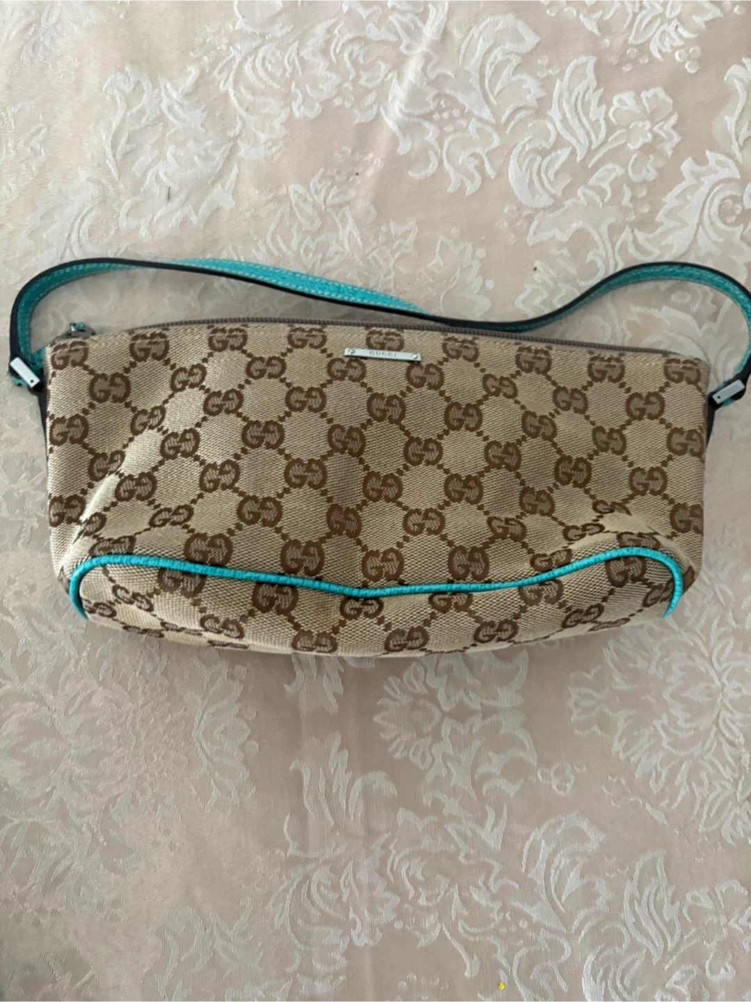 Selling a cute Gucci monogram canvas shoulder bag! It features the classic Gucci monogram pattern with a turquoise trim. It's a stylish and compact bag, perfect for everyday use