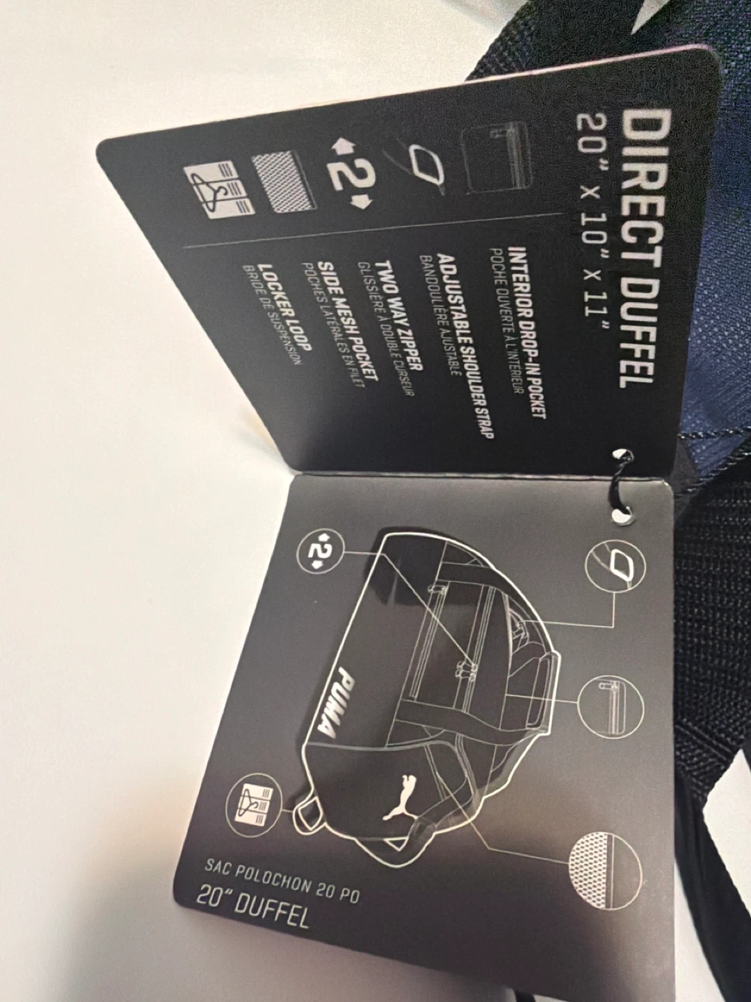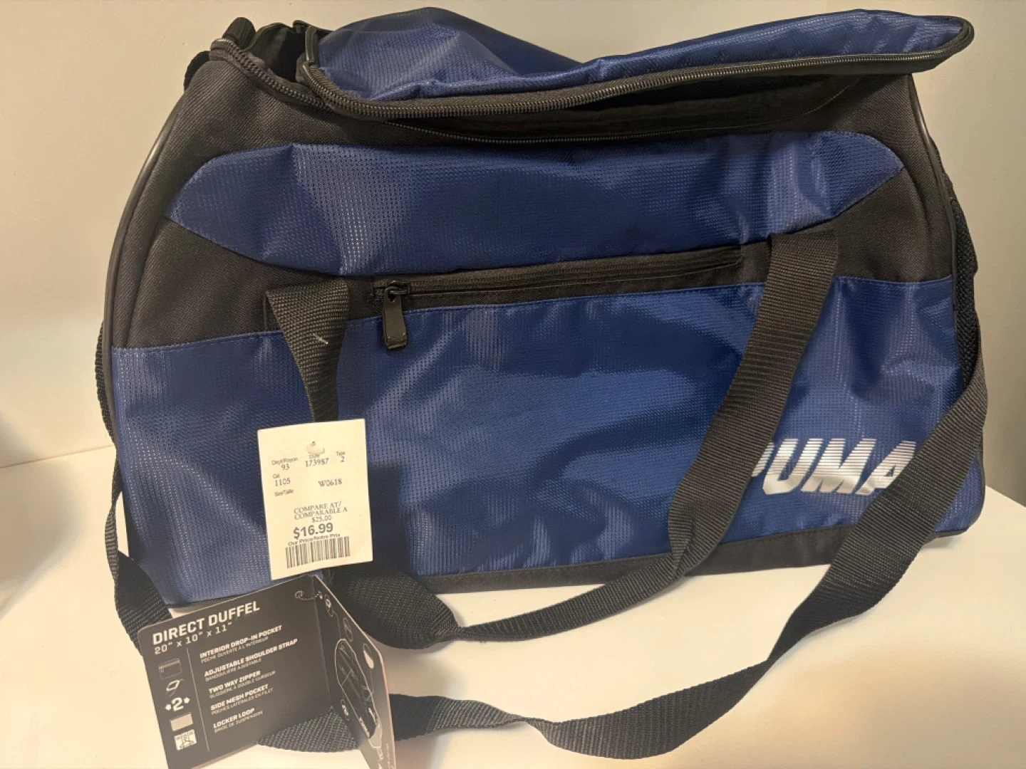 Check out this Puma Direct Duffle bag! It's a great size at 20" x 10" x 11". Features include an interior drop-in pocket, adjustable shoulder strap, two-way zipper, and a side mesh pocket. Originally priced at $16.99.