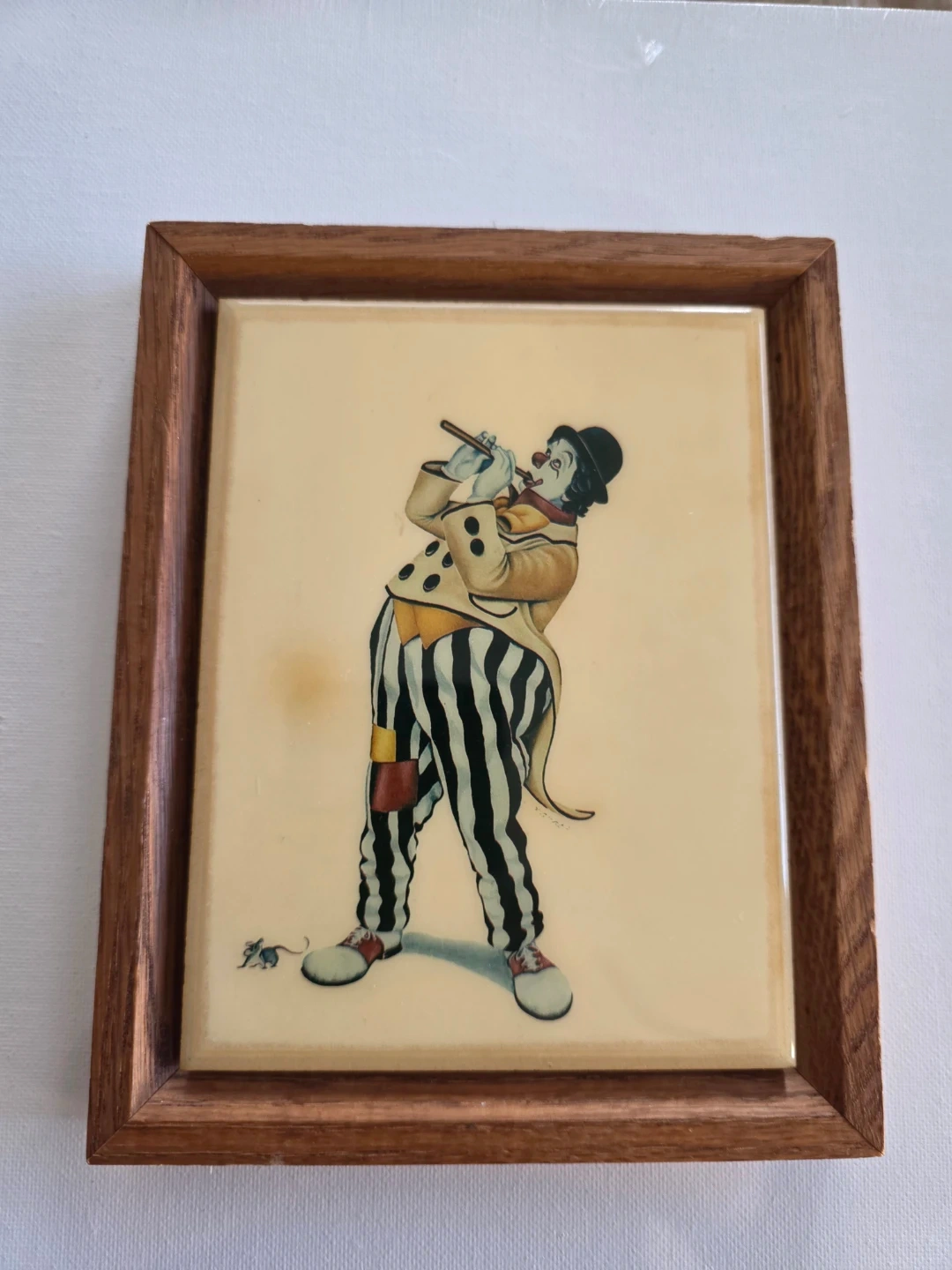 This is a delightful picture of a clown on ceramic tile framed. very good condition.