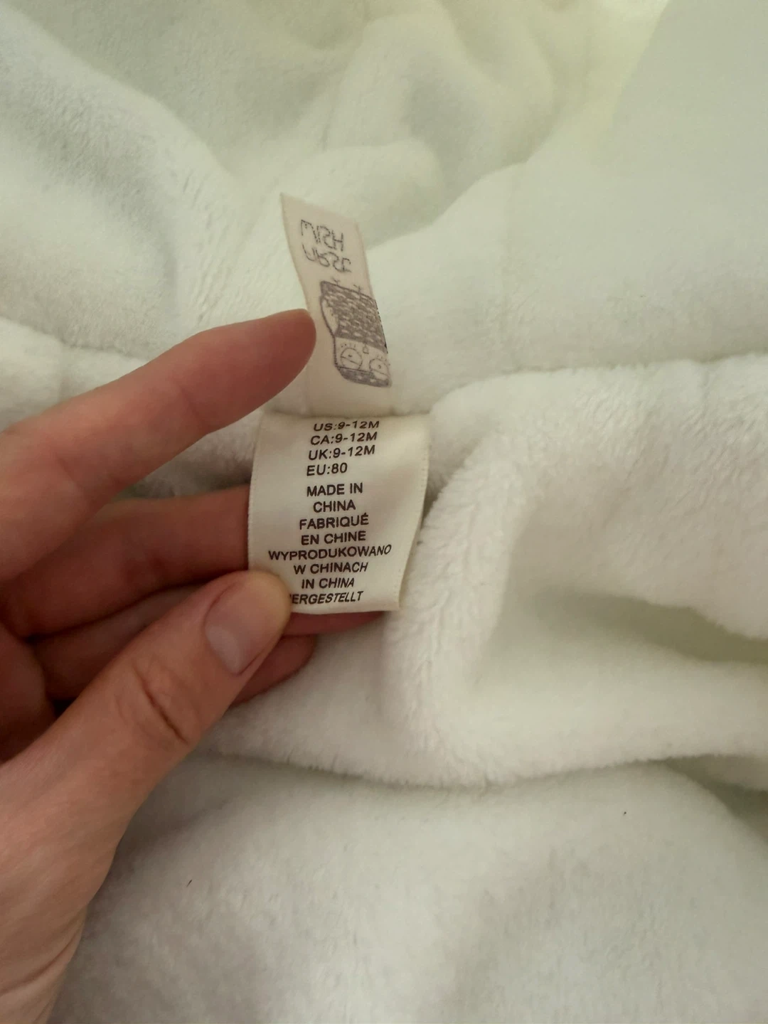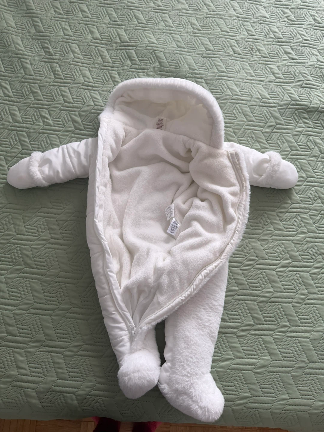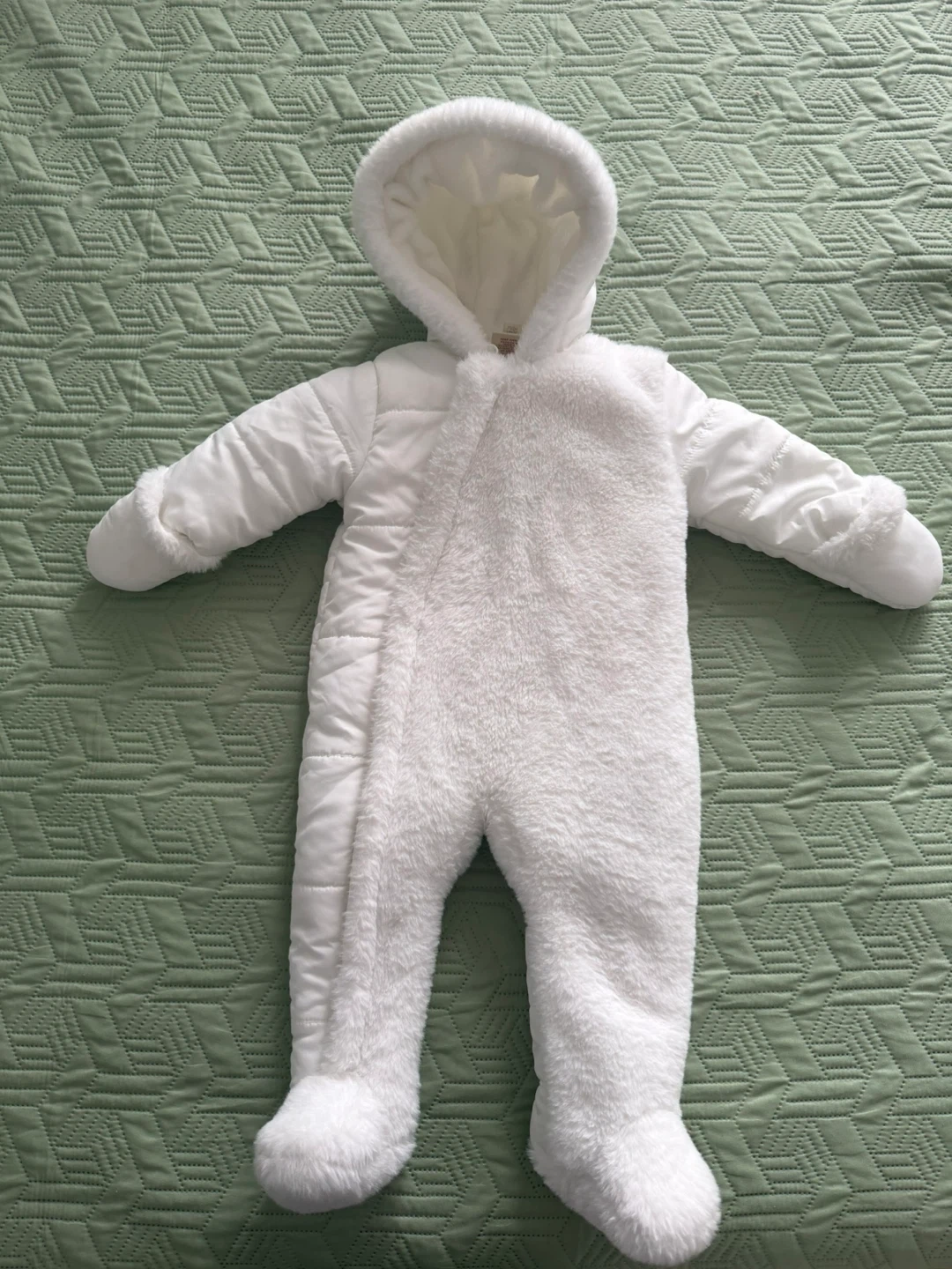 White snowsuit, It's in great condition and perfect for babies aged 6-9 months, even though it’s labeled 9–12 months The soft, plush lining will keep them warm on chilly days, and the attached hood and booties offer extra protection from the elements