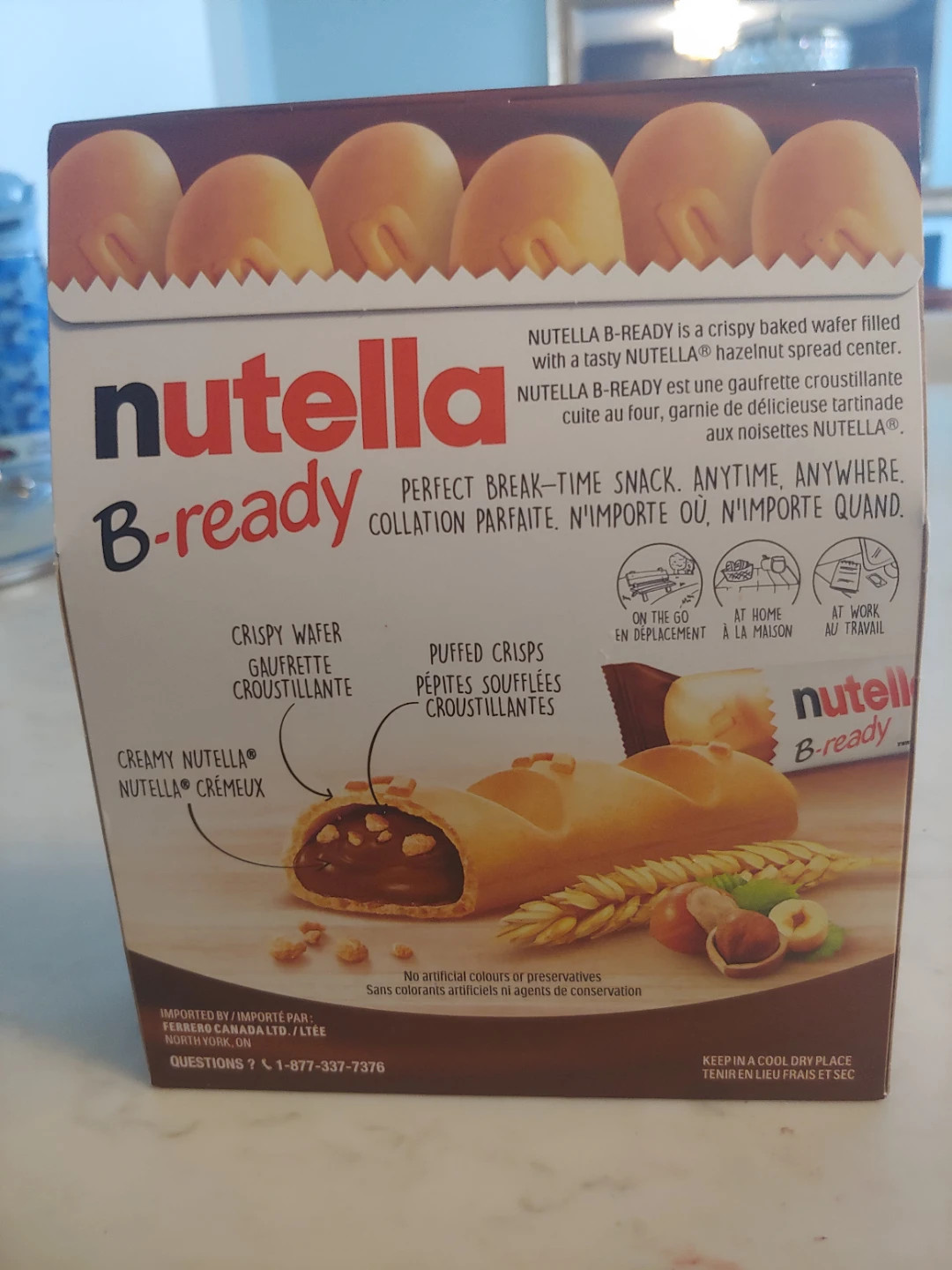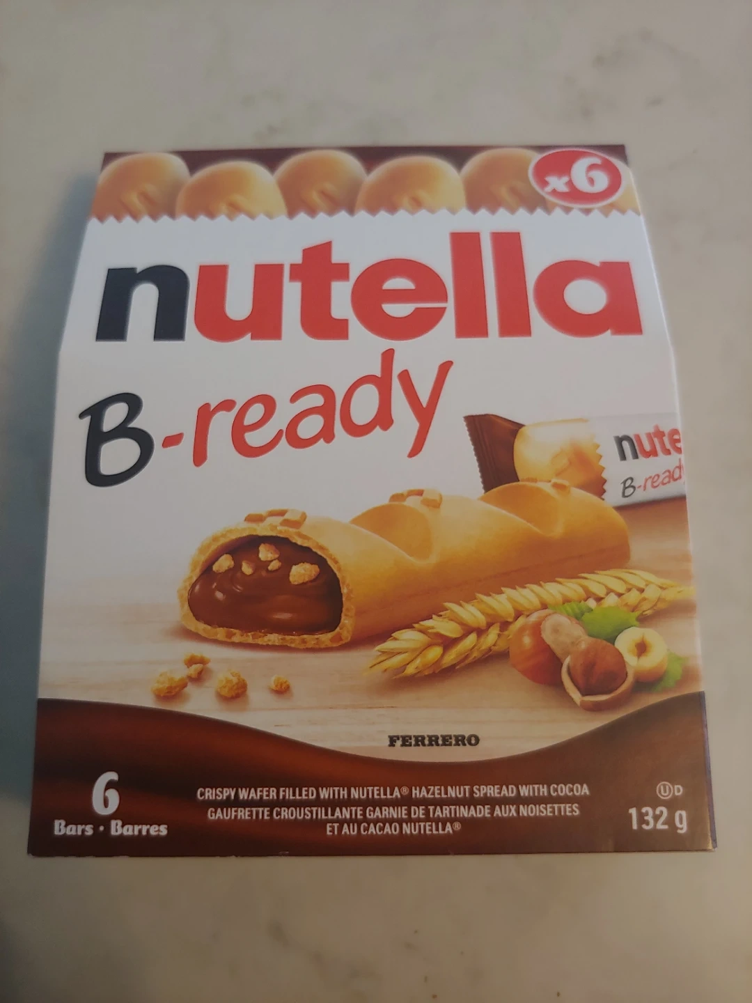 Selling a box of Nutella B-Ready bars! These are crispy baked wafers with a tasty Nutella hazelnut spread centre. Perfect for a quick snack anytime, anywhere. Each box contains 6 bars. Expiry Date: 2026 May 24