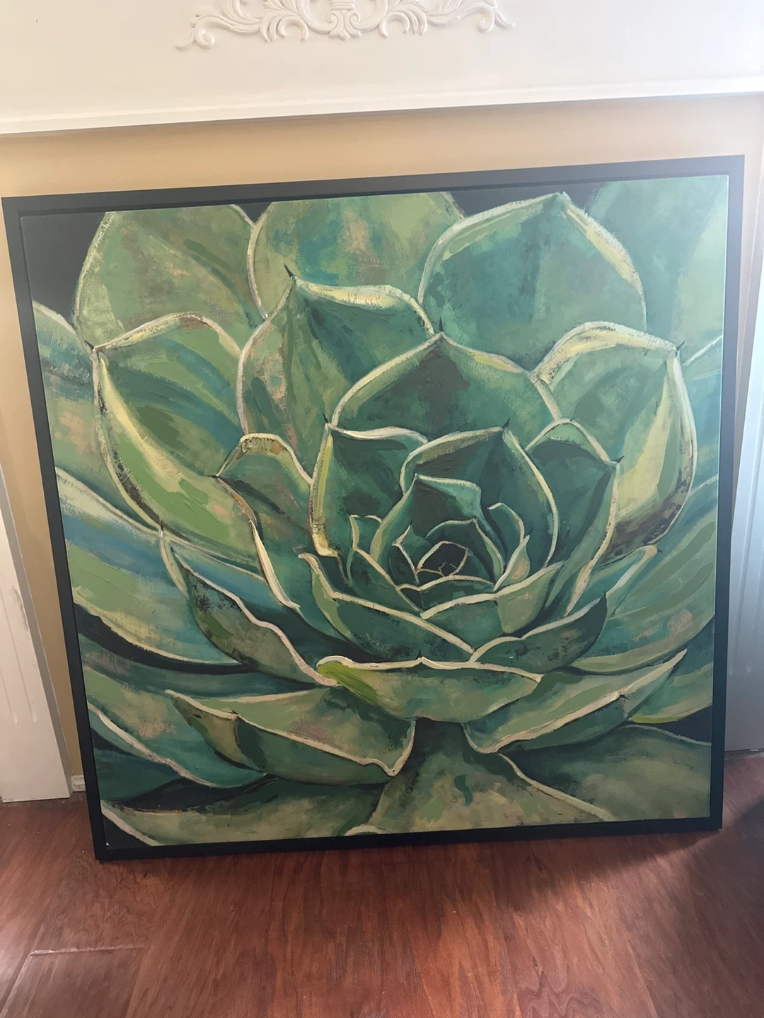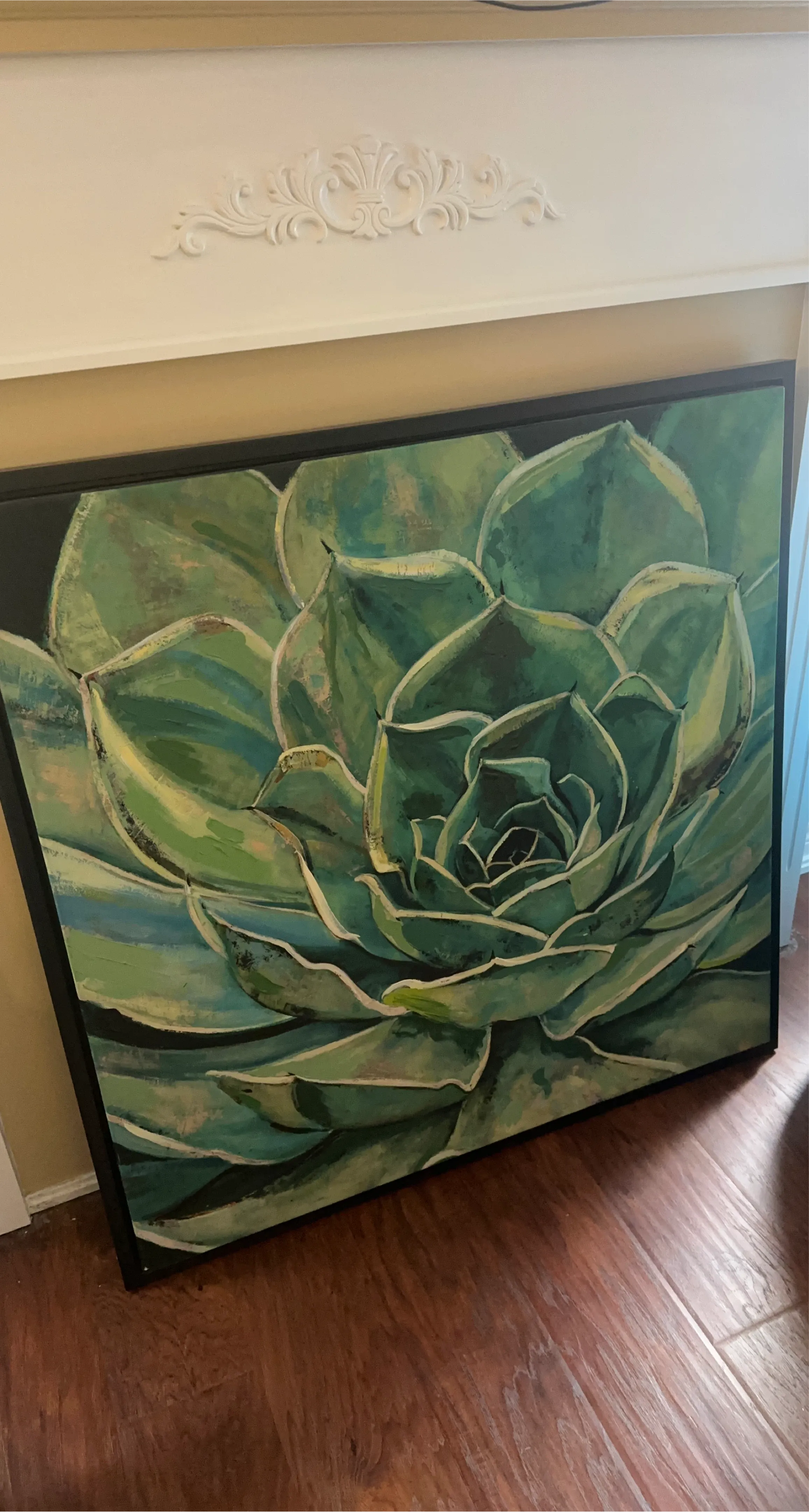 Add a touch of nature to your home with this lovely large-sized succulent wall art! The painting features a beautiful green succulent in a modern black frame. It's in great condition and ready to brighten up any room