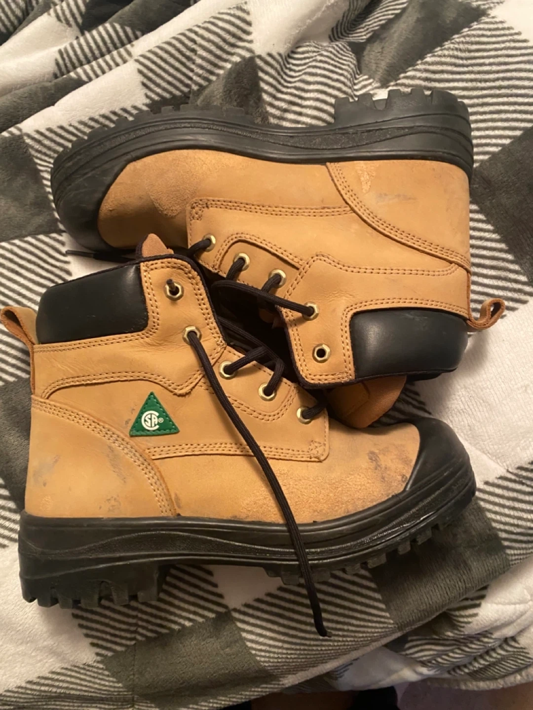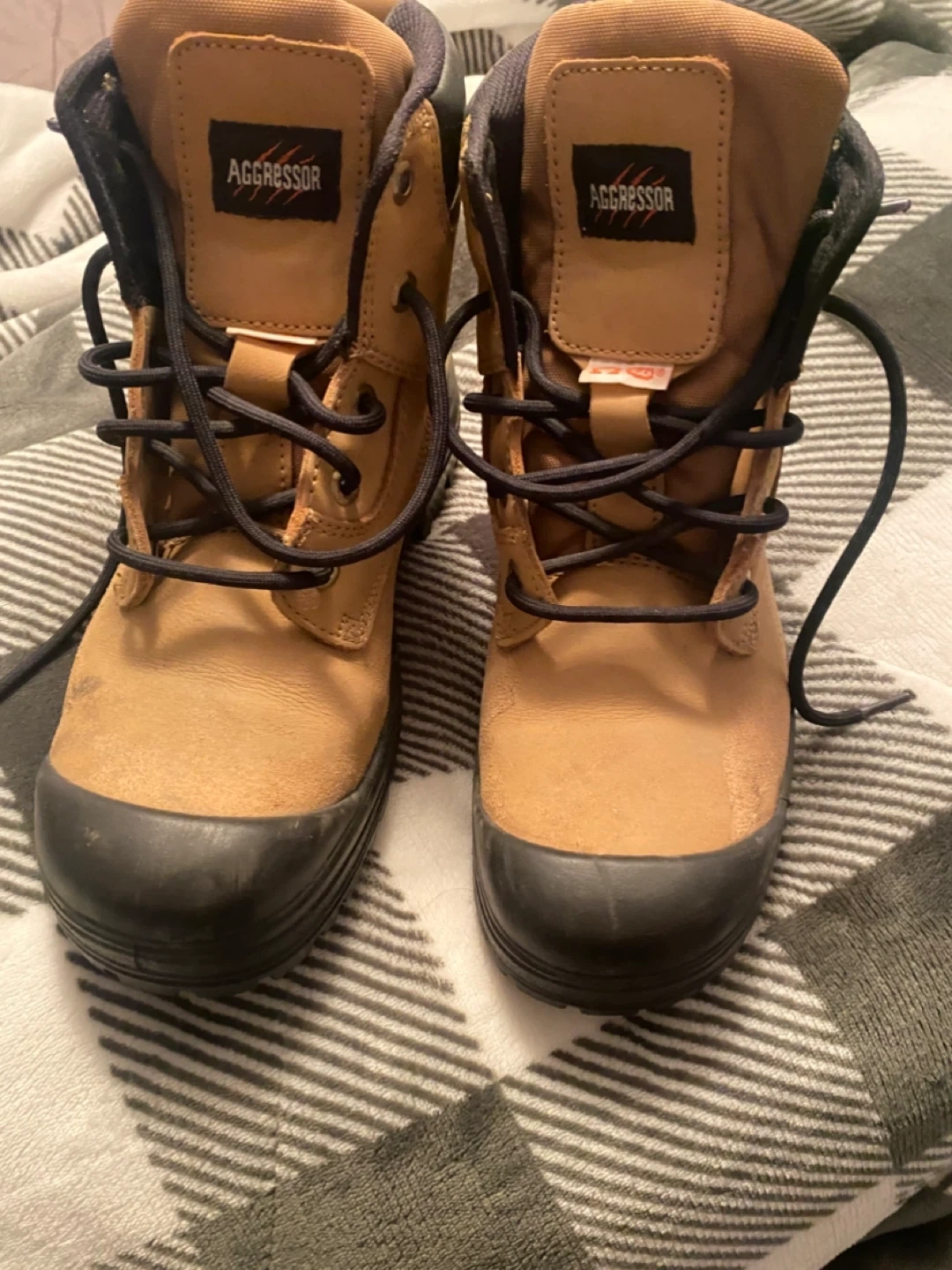 Selling a pair of Dakota Aggressor 400-2 work boots in size 8. They have a tan colour with black accents. These boots are in used condition, perfect for someone needing reliable footwear for work