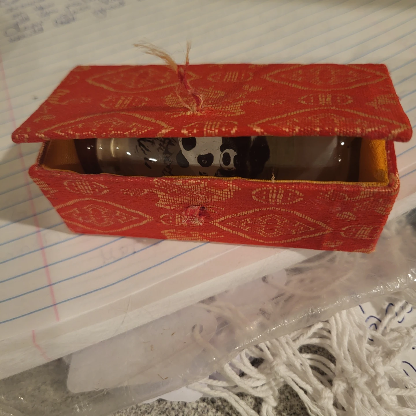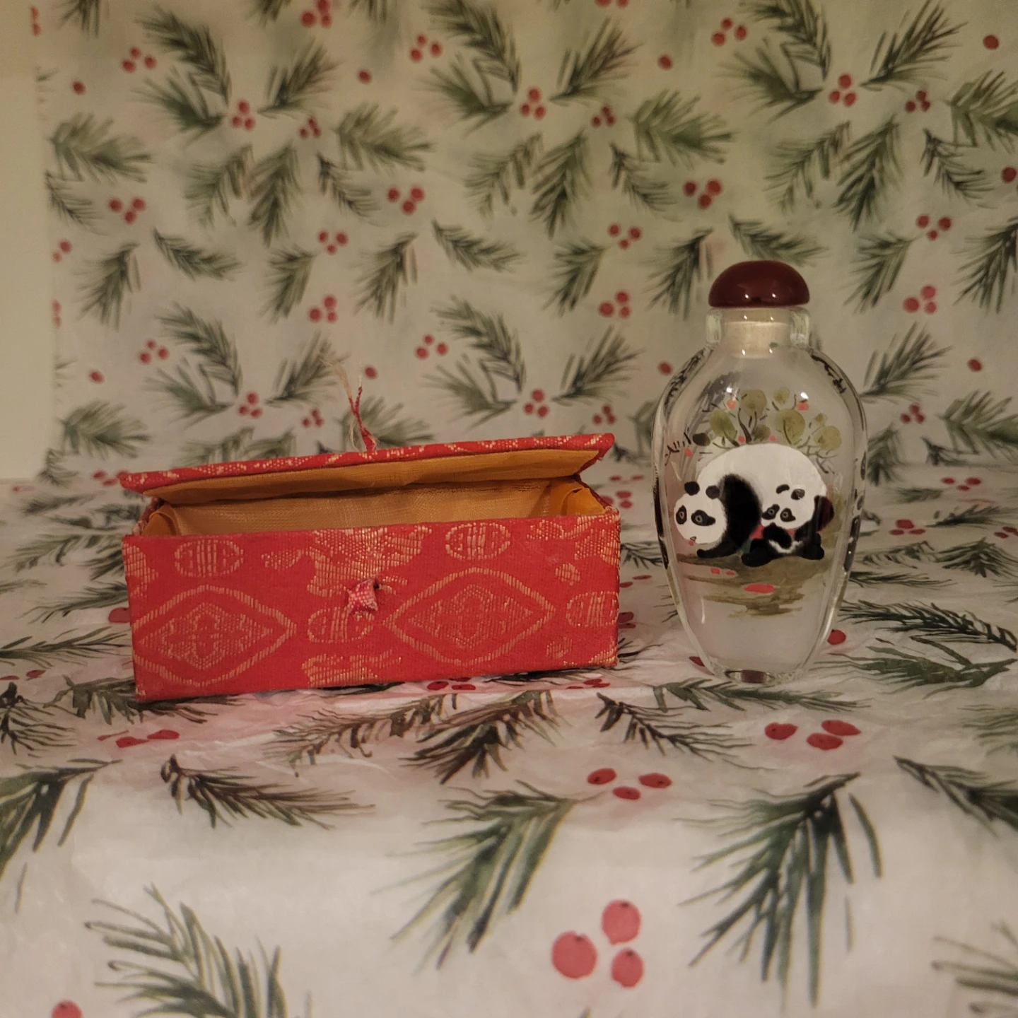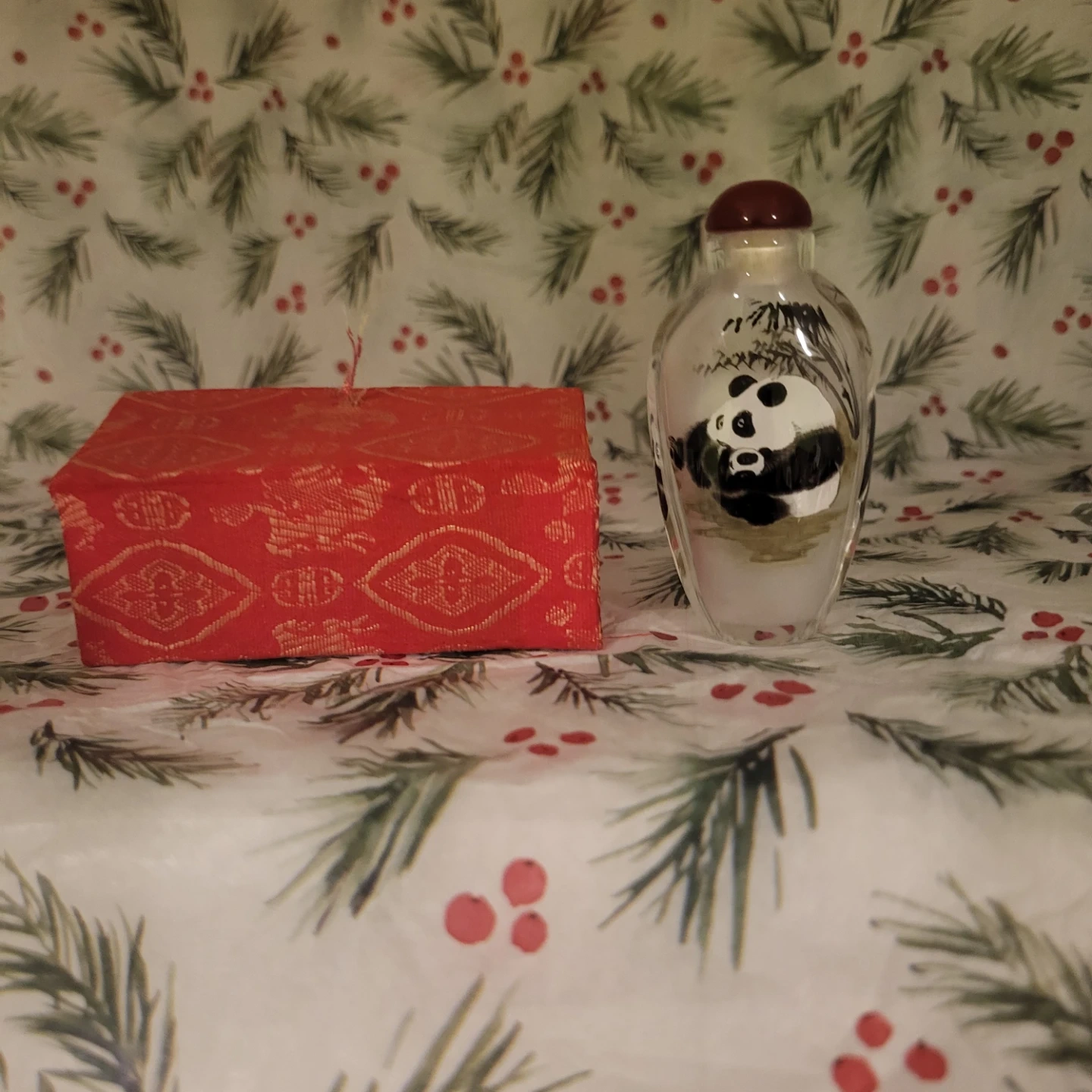 Here's a lovely panda snuff bottle that comes with its original box! It features a detailed panda design inside the glass bottle. Perfect for collectors or as a unique decorative piece