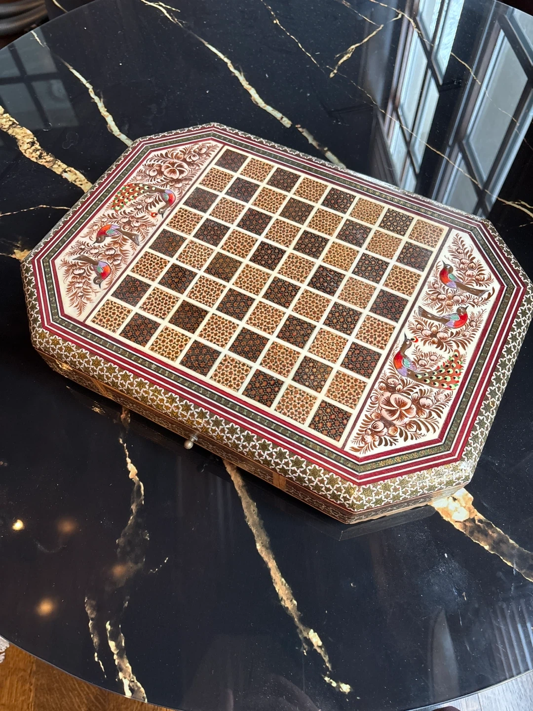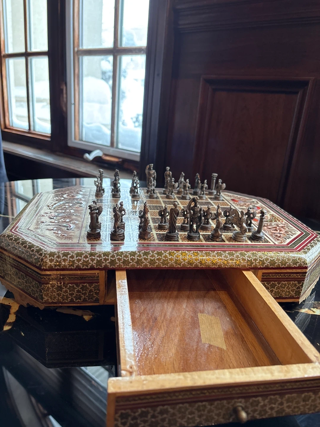 Selling a unique decorative chess set! It features a beautifully designed board with an integrated drawer for storing the chess pieces. A great addition to any collection or a stylish piece for your home