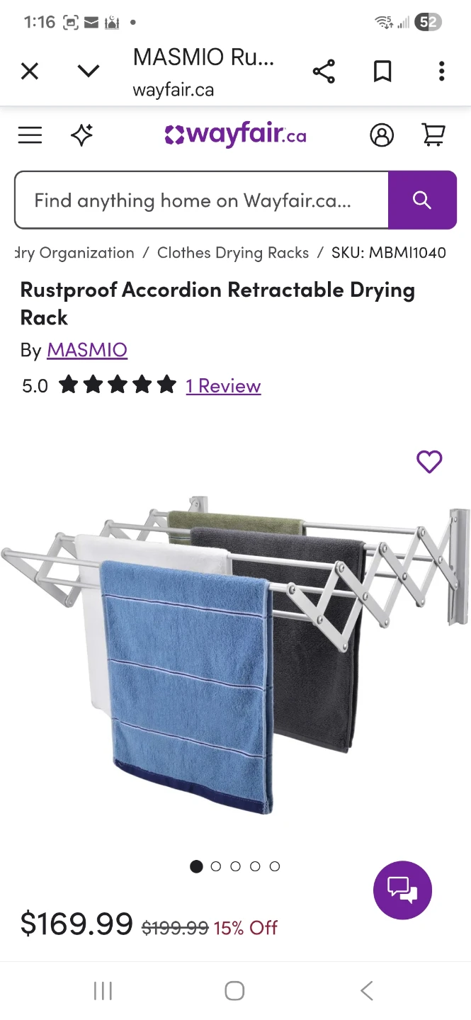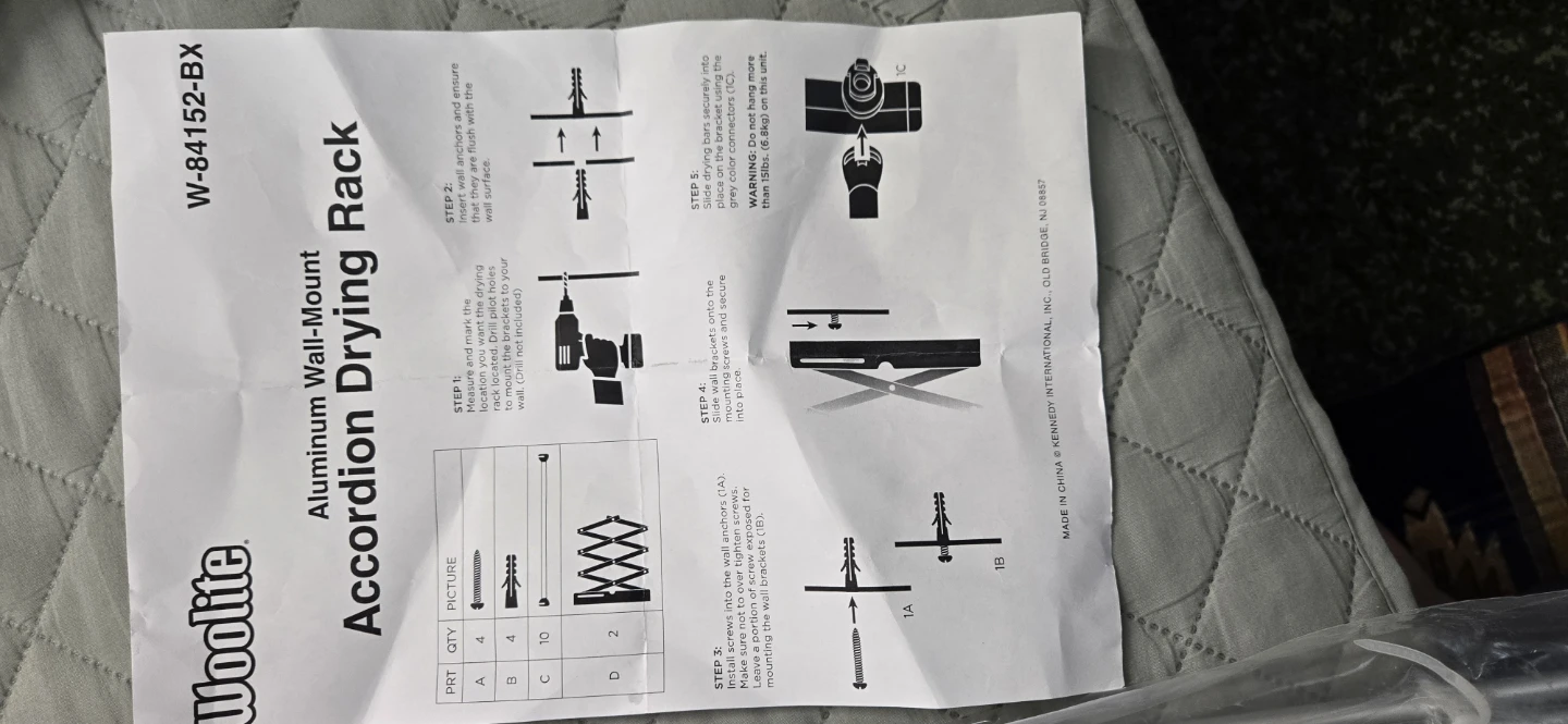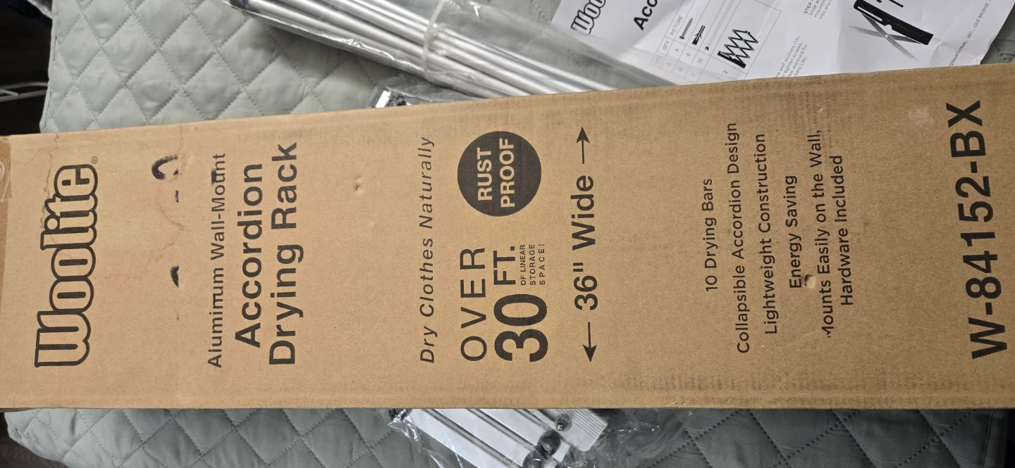 Selling a brand new Woolite Aluminum Wall-Mount Accordion Drying Rack. It's still in its original packaging! This rack is rust proof and 36" wide, providing over 30 feet of linear space for drying clothes accordion design for lightweight construction and energy saving. Mounts easily on the wall, with hardware i.