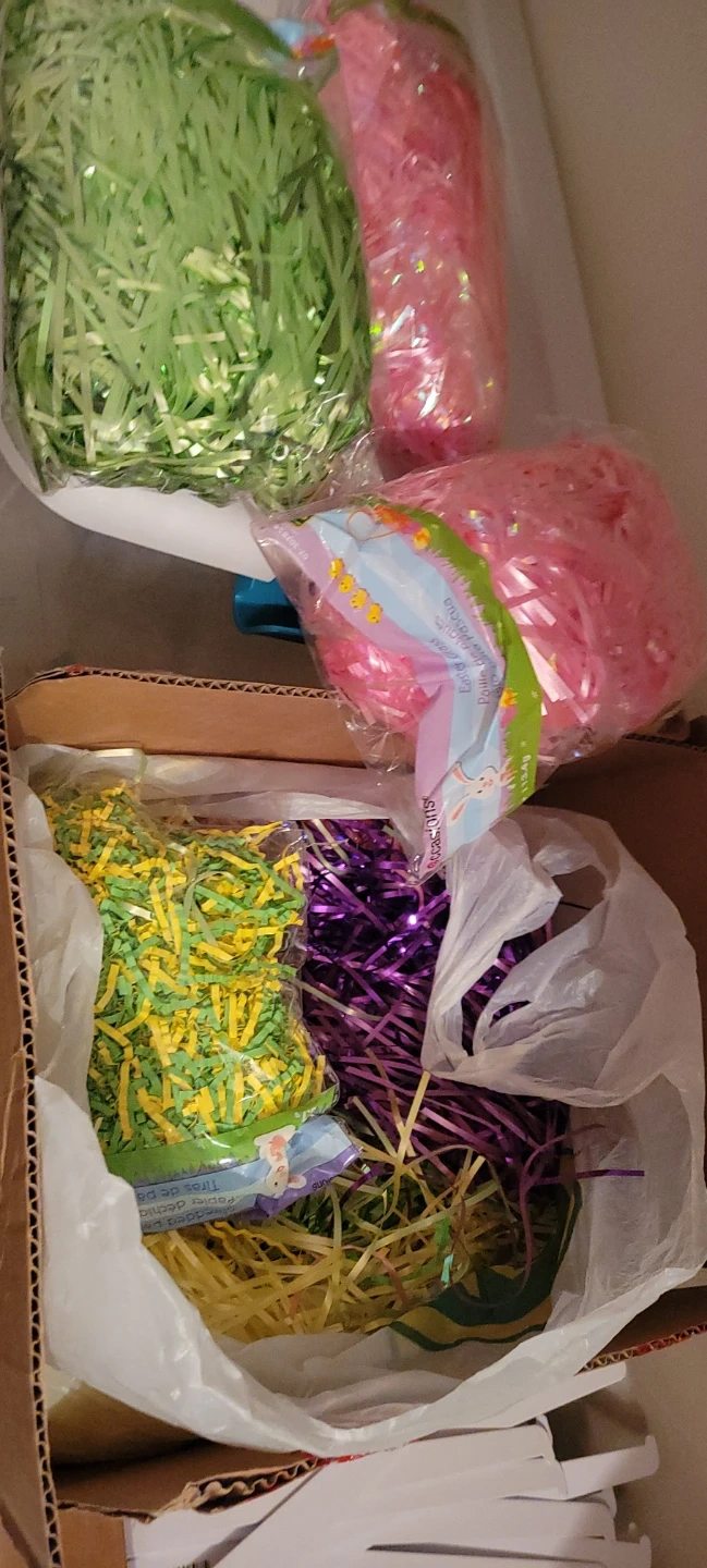 Selling a variety of Easter grass in different colours! You'll get green, pink, yellow, and purple. Perfect for filling Easter baskets or for any craft project that needs a little extra colour and texture