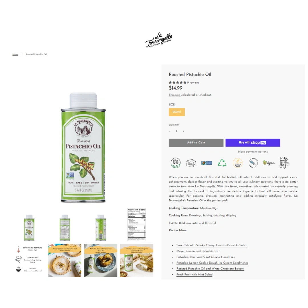 La Tourangelle Roasted NON GMO Pistachio Oil, 100% PURE PISTACHIO OIL.