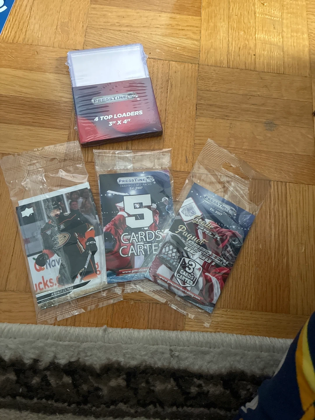 I have some Presstine trading card packs and top loaders for sale! There are three packs of trading cards, and a pack of 4 top loaders that measure 3" x 4"