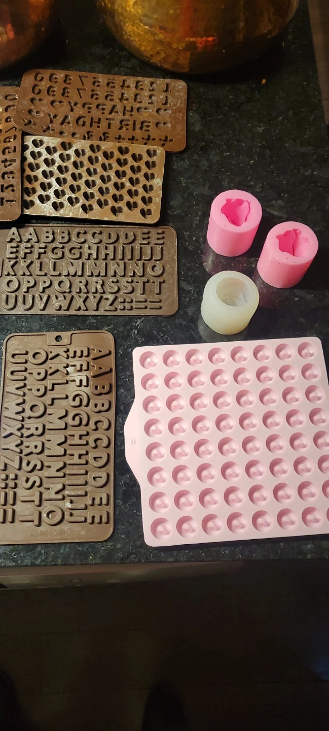 I'm selling a collection of silicone chocolate molds! There's a variety of fun shapes, including letters, numbers, hearts, eggs, and more. Perfect for making chocolates, candies, or even soaps! They are in good condition and ready for your next baking project