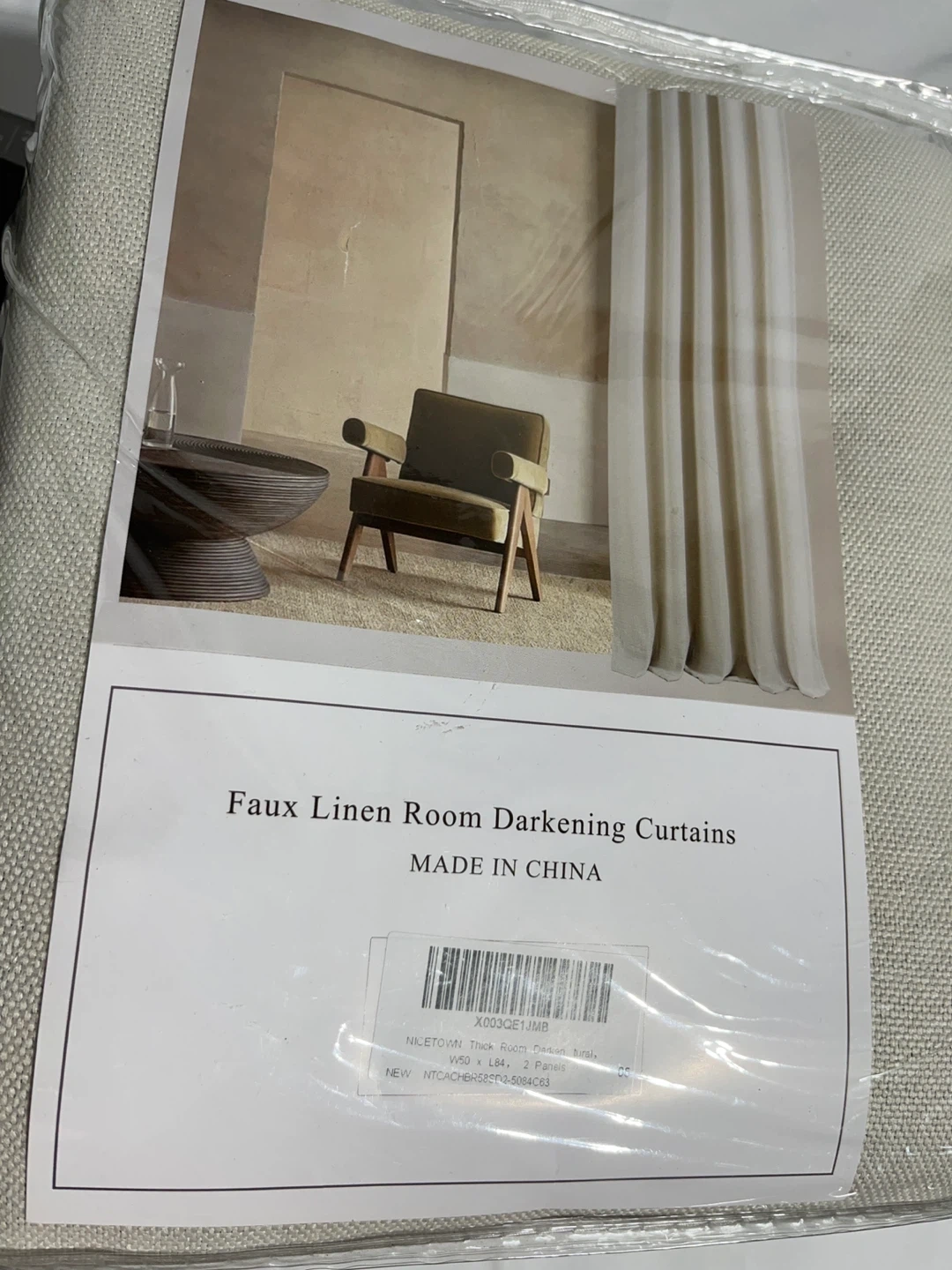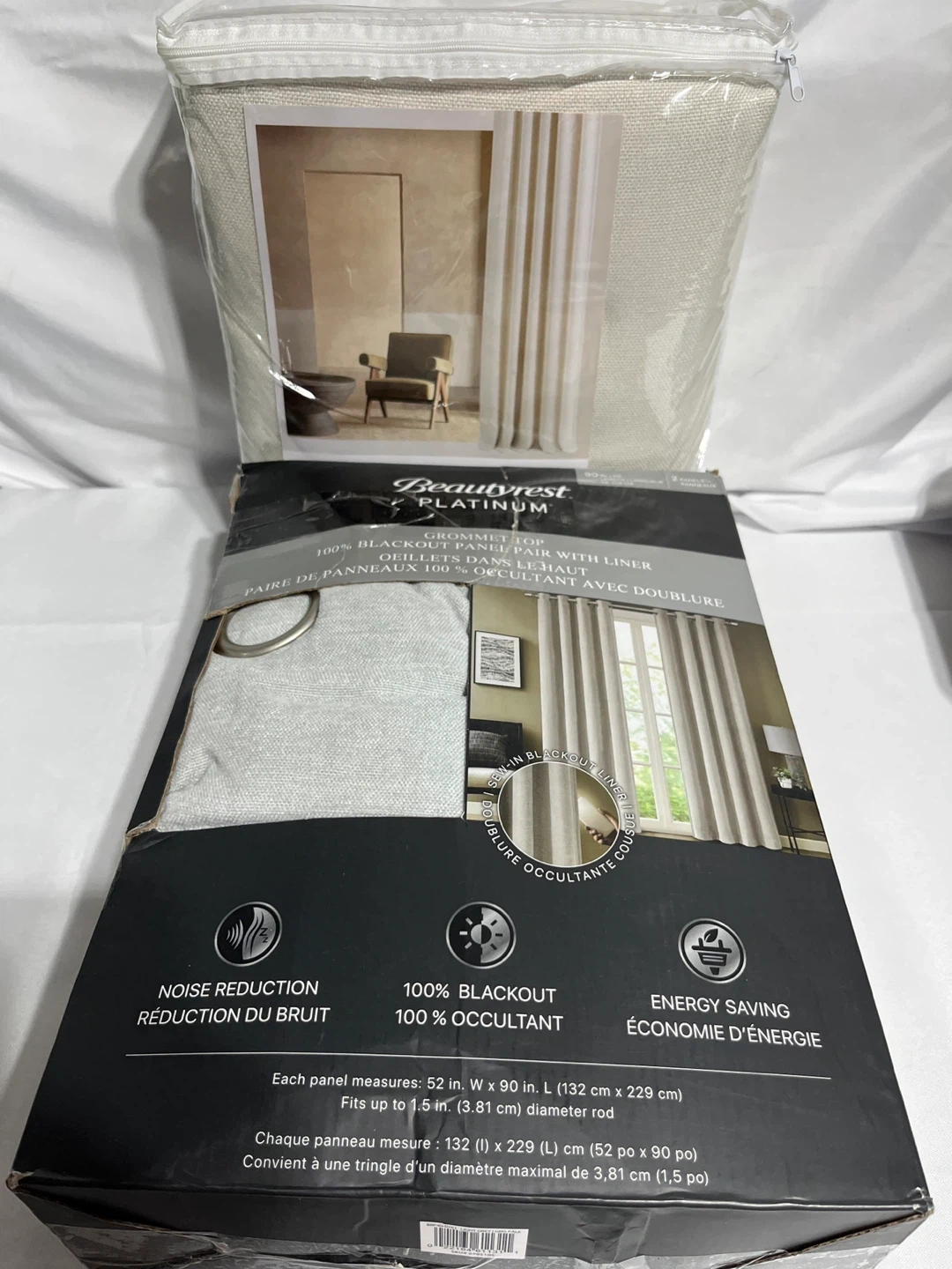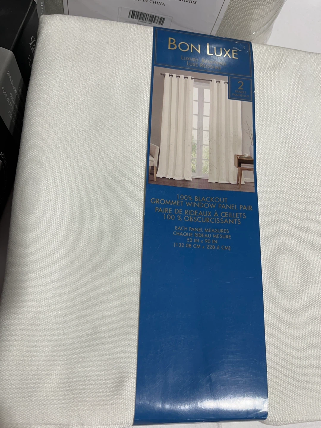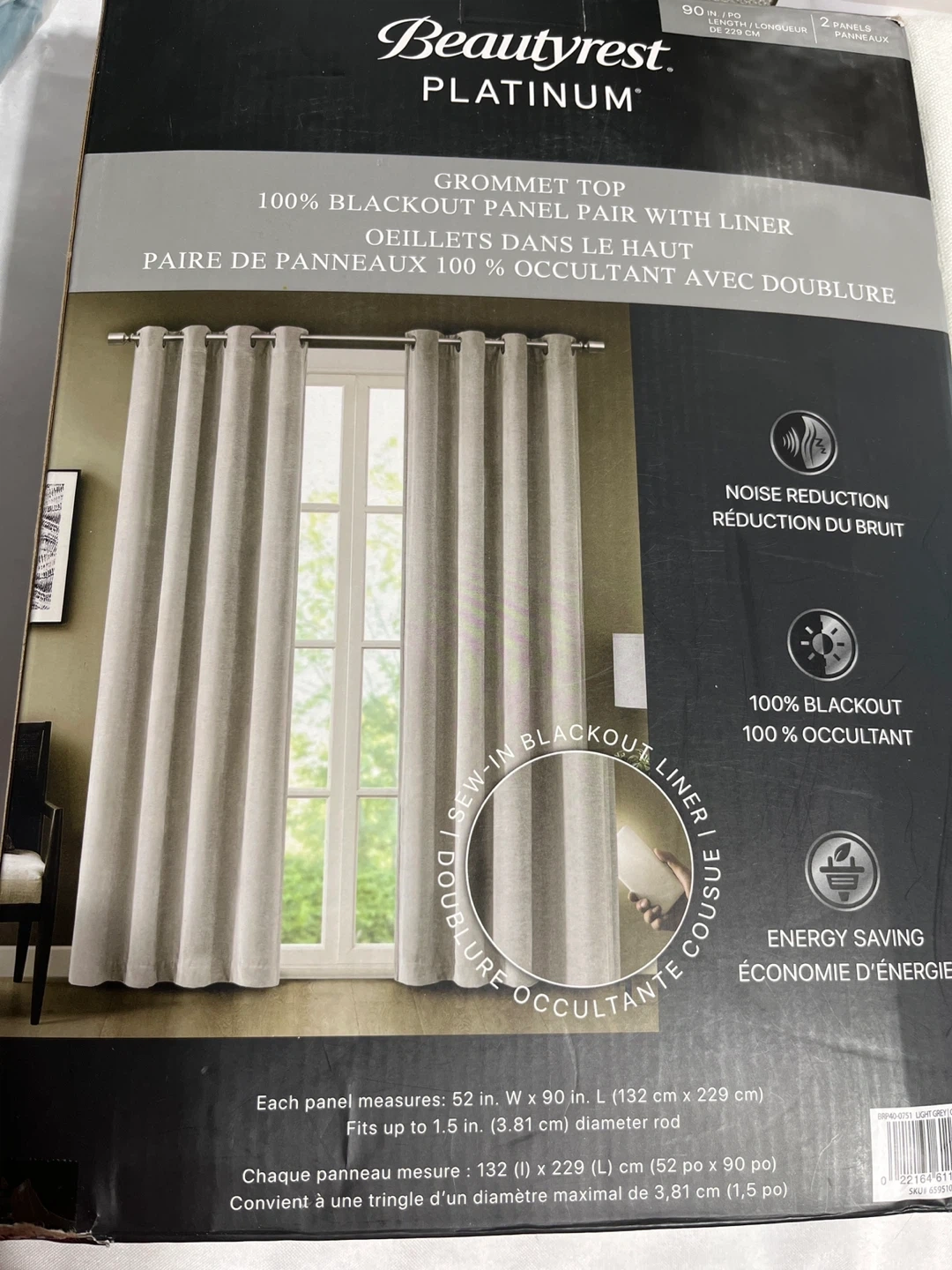 I'm selling a pair of Bon Luxe luxury blackout grommet window panels! These panels are 100% blackout and come in a pair. Each panel measures 132.08 cm x 228.6 cm. They are designed to reduce noise and save energy, and have a sew-in blackout liner