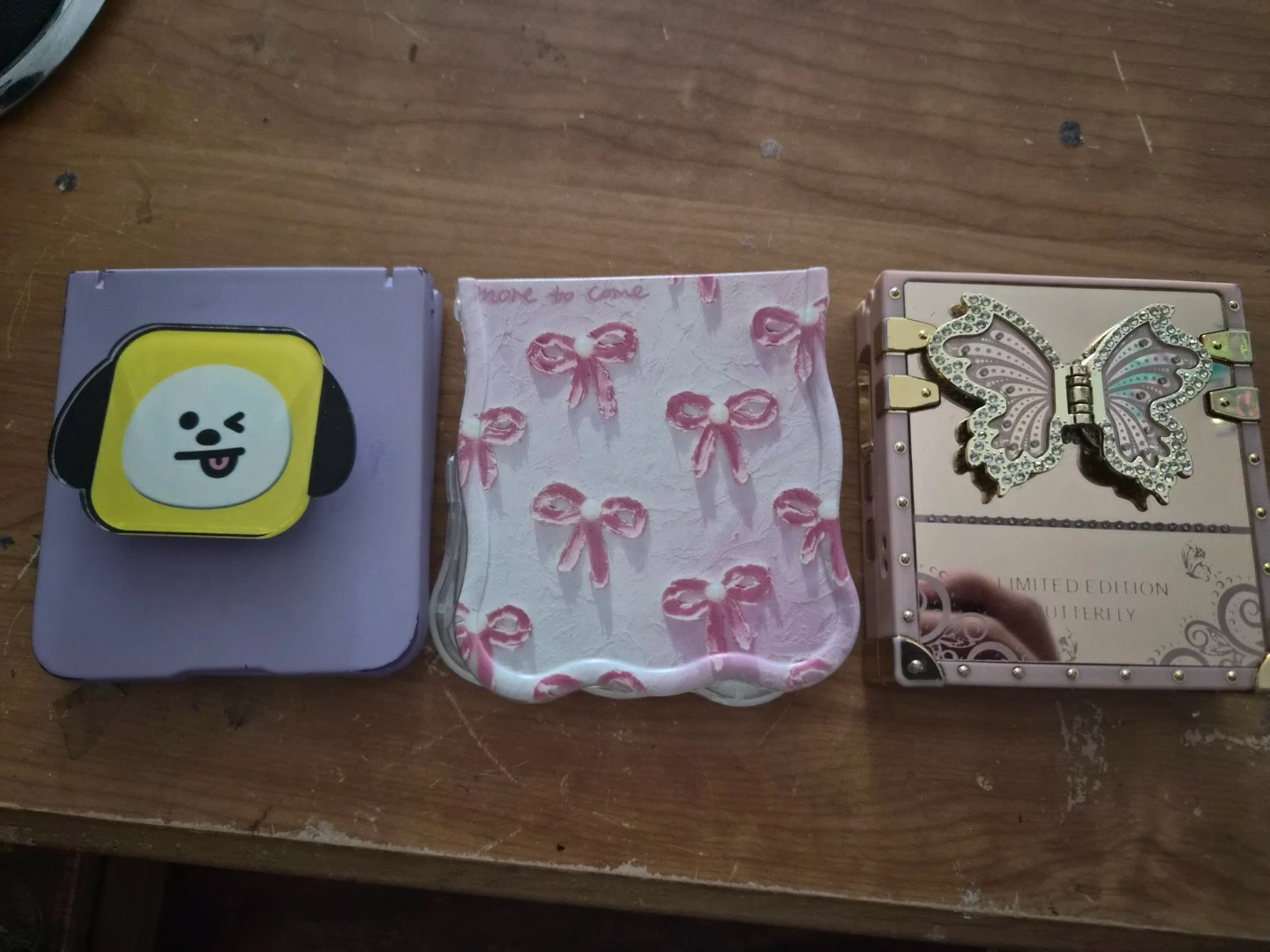 Selling a few cute cases for the Samsung Z Flip 5! There's a purple one with a Chimmy design, a pink one with bows, and a limited edition butterfly case. All in great shape and ready to add some personality to your phone