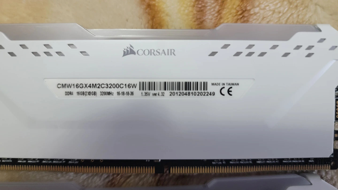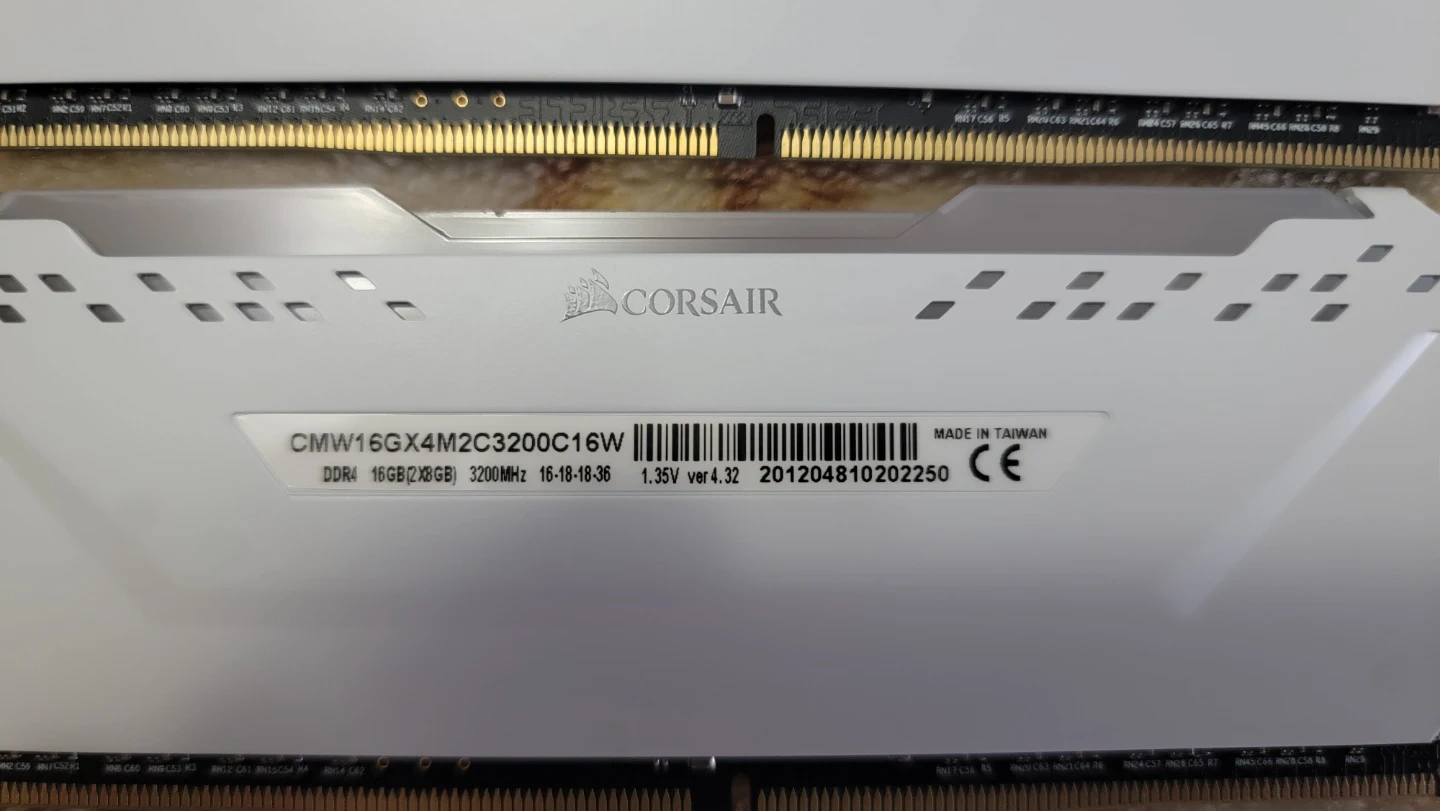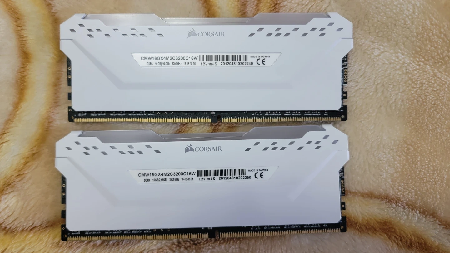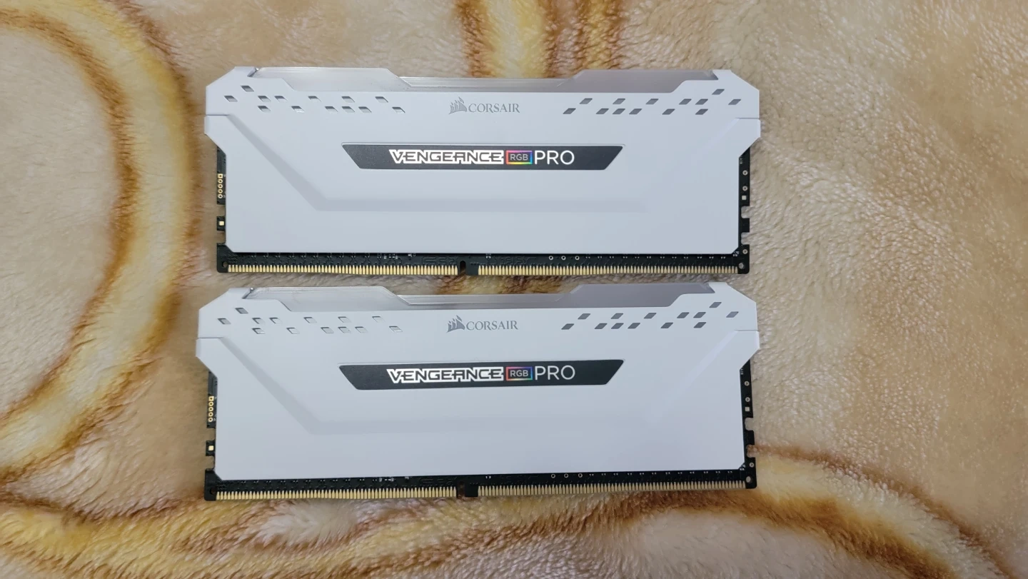 Selling a set of Corsair Vengeance Pro 16GB (2x8GB) DDR4 RAM in white. The model number is CMW16GX4M2C3200C16W. It runs at 3200MHz.