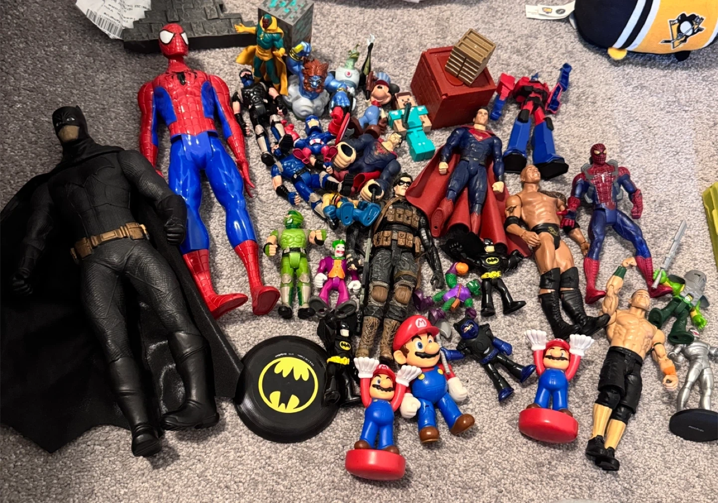 Selling a mixed lot of action figures! Includes characters like Batman, Spiderman, Mario, Superman, and some wrestlers. Great for collectors or kids who love imaginative play!