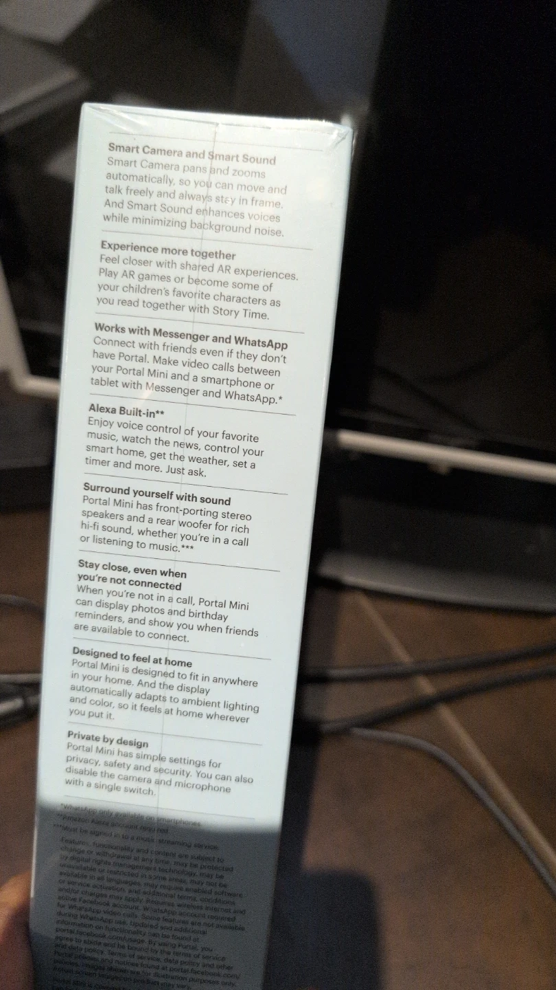 Not open , factory sealed π€ Selling a brand new Facebook Portal Mini Smart Display with Alexa. It's perfect for smart video calling, designed to fit anywhere in your home. It has simple settings for privacy and security. Enjoy voice control of your music, watch the news, control your smart home, get the weather, set a timer and more, just ask
