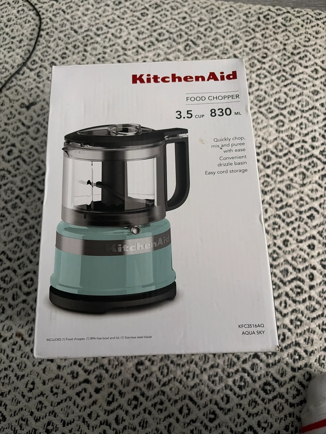 Selling a Brand new KitchenAid Food Chopper in Aqua Sky! It's a 3.5 cup (830 ml) chopper that's great for quickly chopping, mixing, and pureeing. It's easy to use and store, with a compact, lightweight design. Also features a convenient drizzle basin and easy cord storage! Includes the food chopper, a BPA-free bowl and lid, and a stainless steel blade