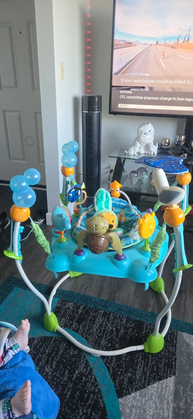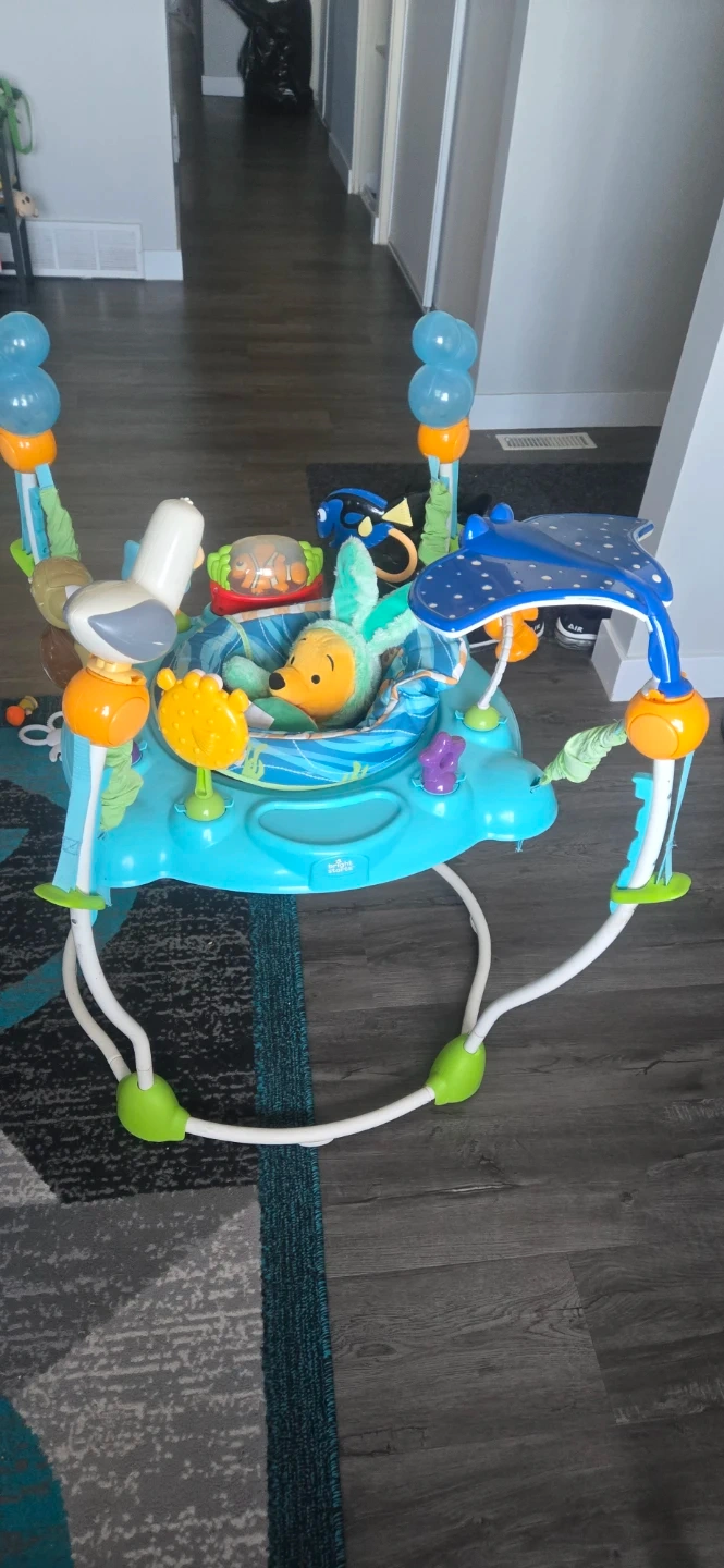This is a Bright Starts Disney Baby activity jumper, perfect for keeping your little one entertained! It features various toys and activities to stimulate your baby's senses and development. It's in great condition and ready for a new home!