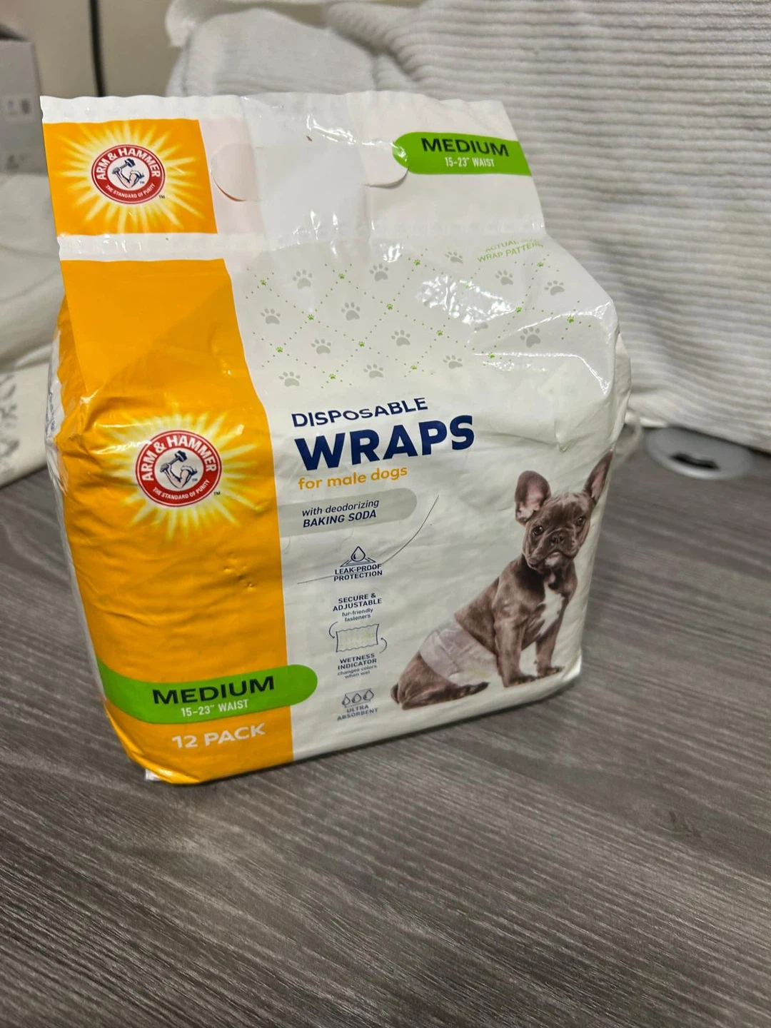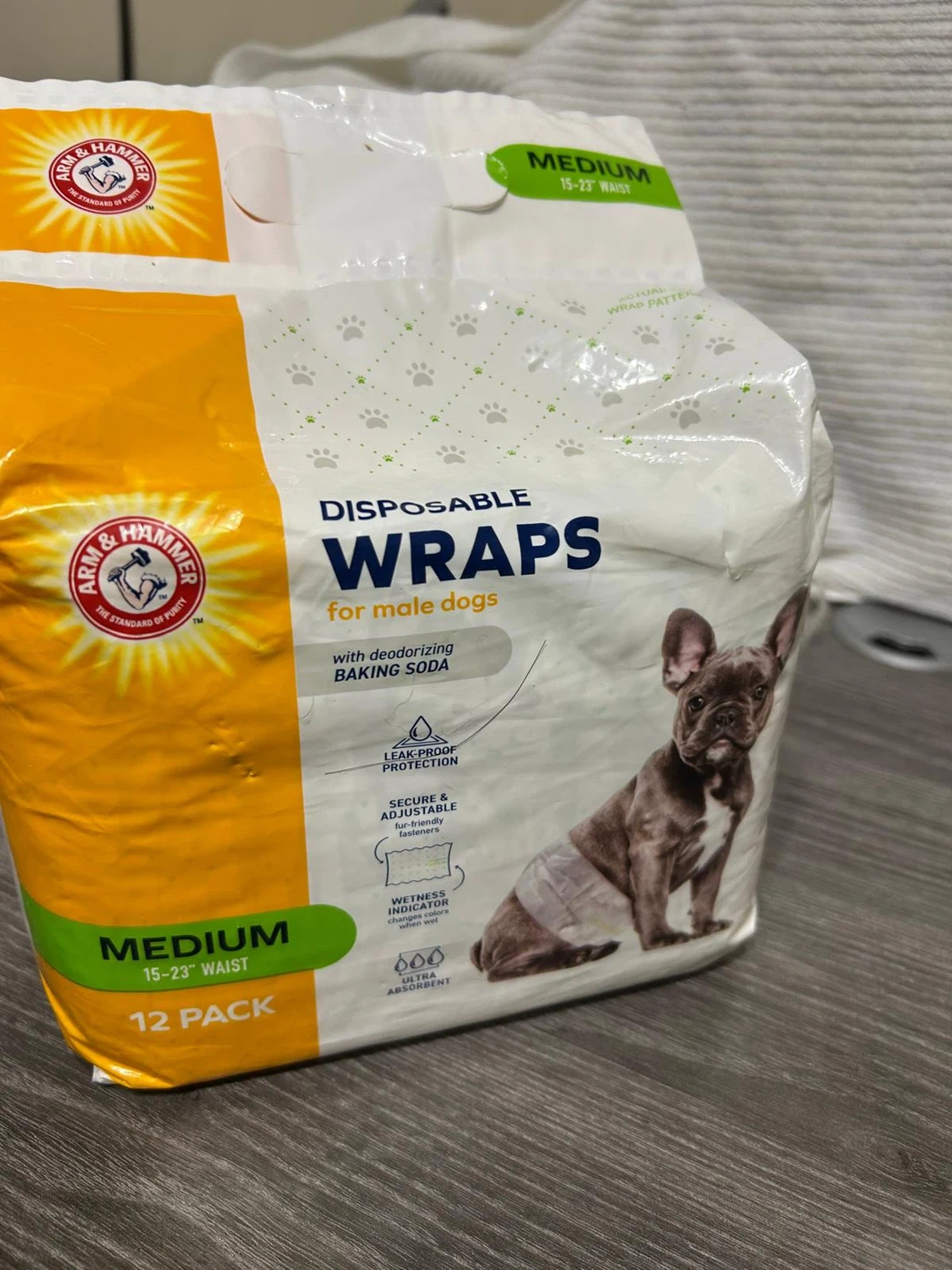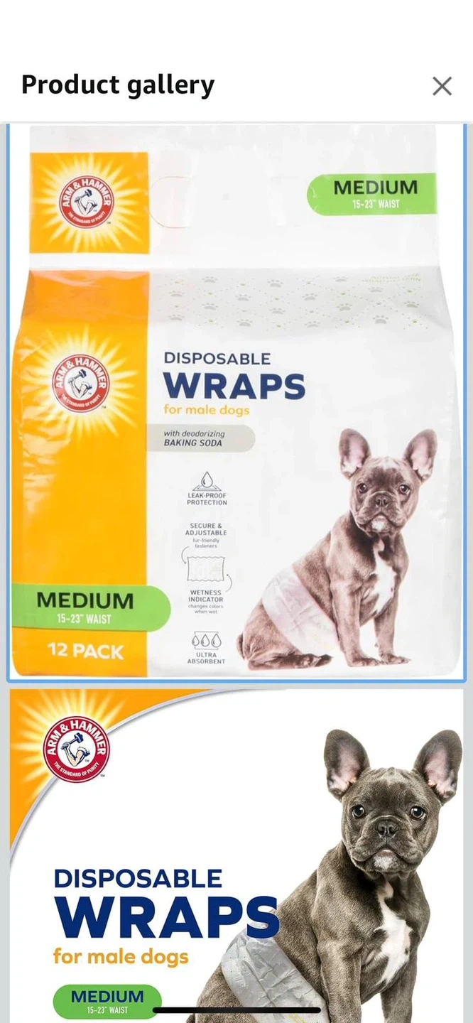 Arm & Hammer new Disposable Wraps for male dogs, size medium (15-23" waist). Contains deodorizing baking soda for leak-proof protection. Secure and adjustable fasteners with a wetness indicator, and are ultra absorbent. 12 pack! Pick up at Islington /401 / bergamot avenue Etobicoke.