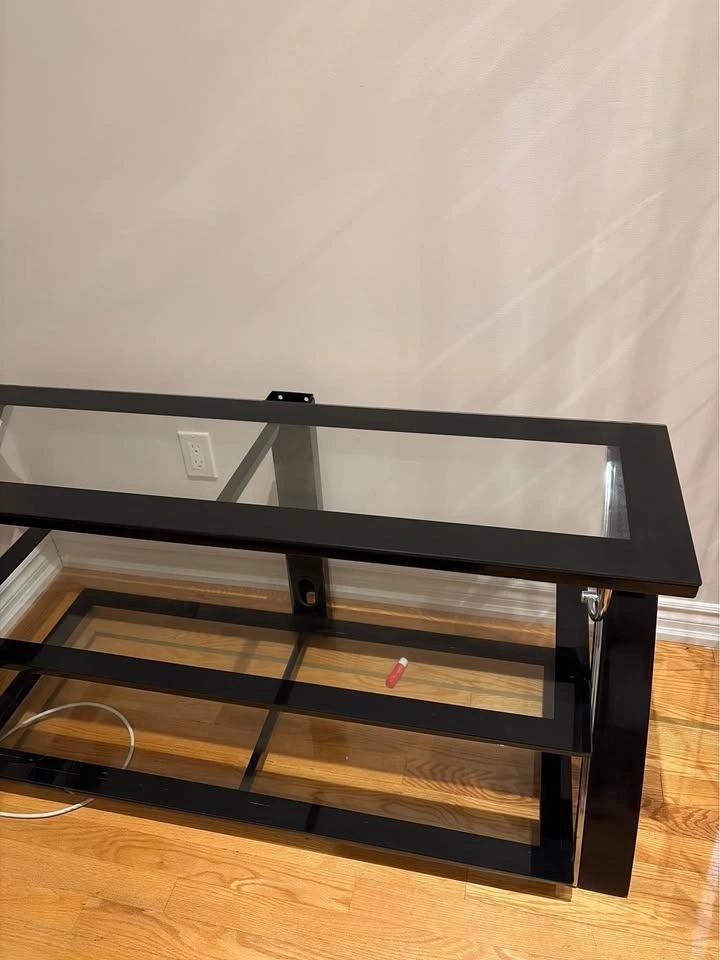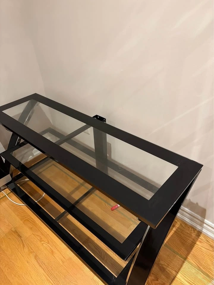 Stylish modern TV stand with a black glass and metal design. Features a spacious top surface and multiple glass shelves—perfect for a TV, sound system, gaming consoles, or media accessories. Solid and stable construction with a sleek, contemporary look that fits well in any living room or entertainment space.