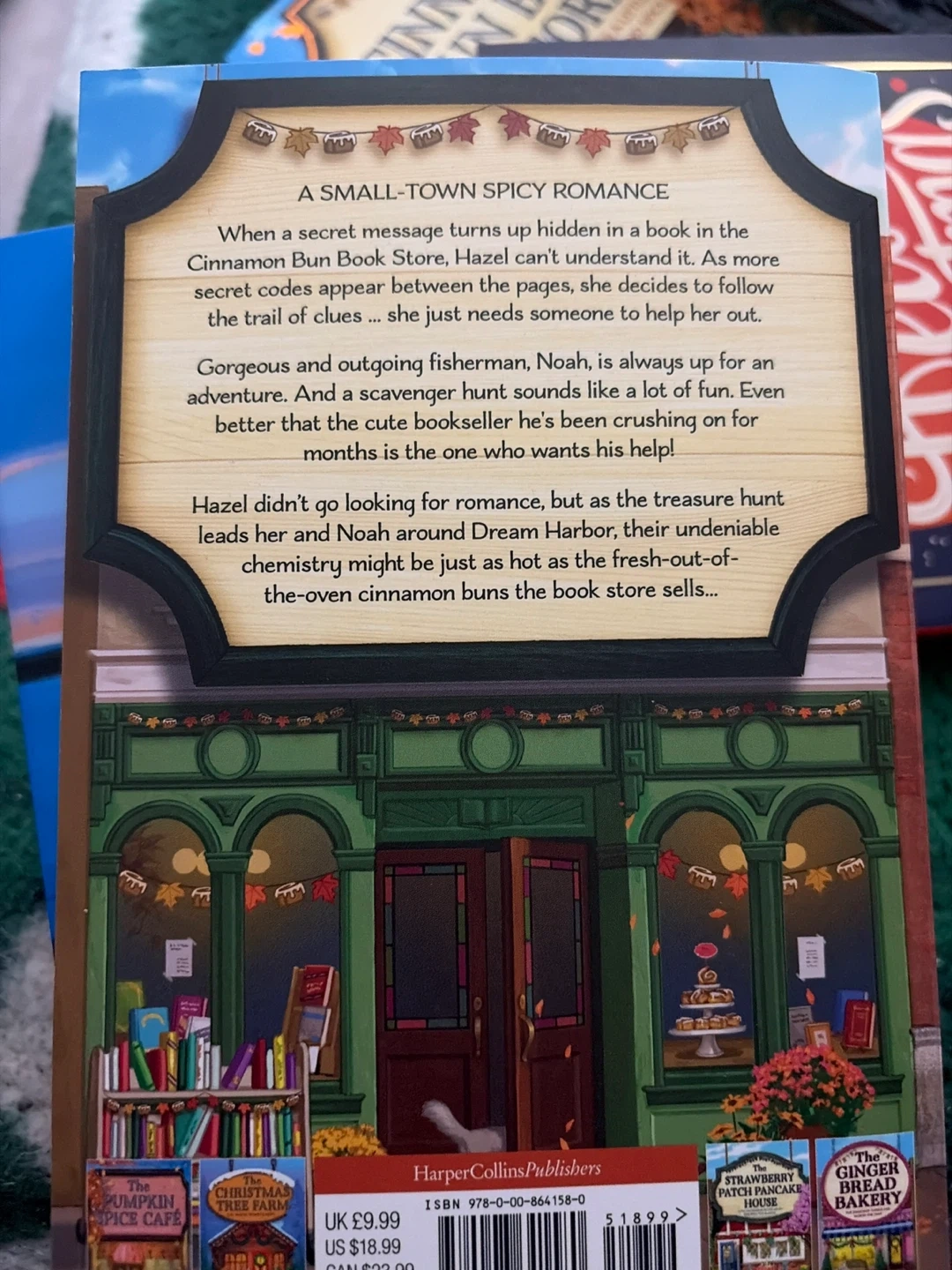 Selling "The Cinnamon Bun Book Store" by Laurie Gilmore! It's a small-town spicy romance about a secret message hidden in a book. Hazel can't understand it, and secret codes appear between the pages. She decides to follow the trail of clues and needs someone to help her out! Gorgeous and outgoing fisherman, Noah, is always up for an adventure