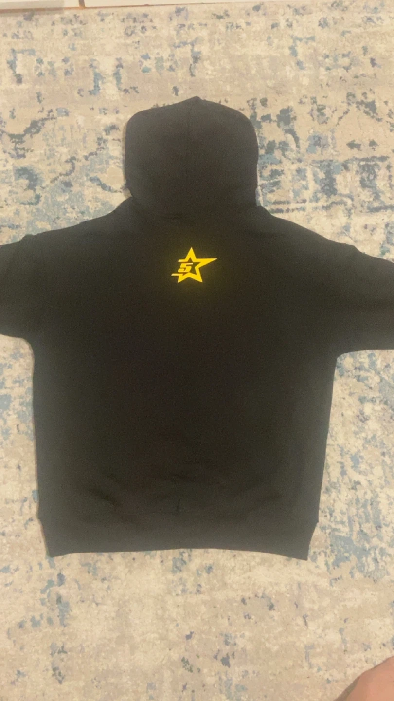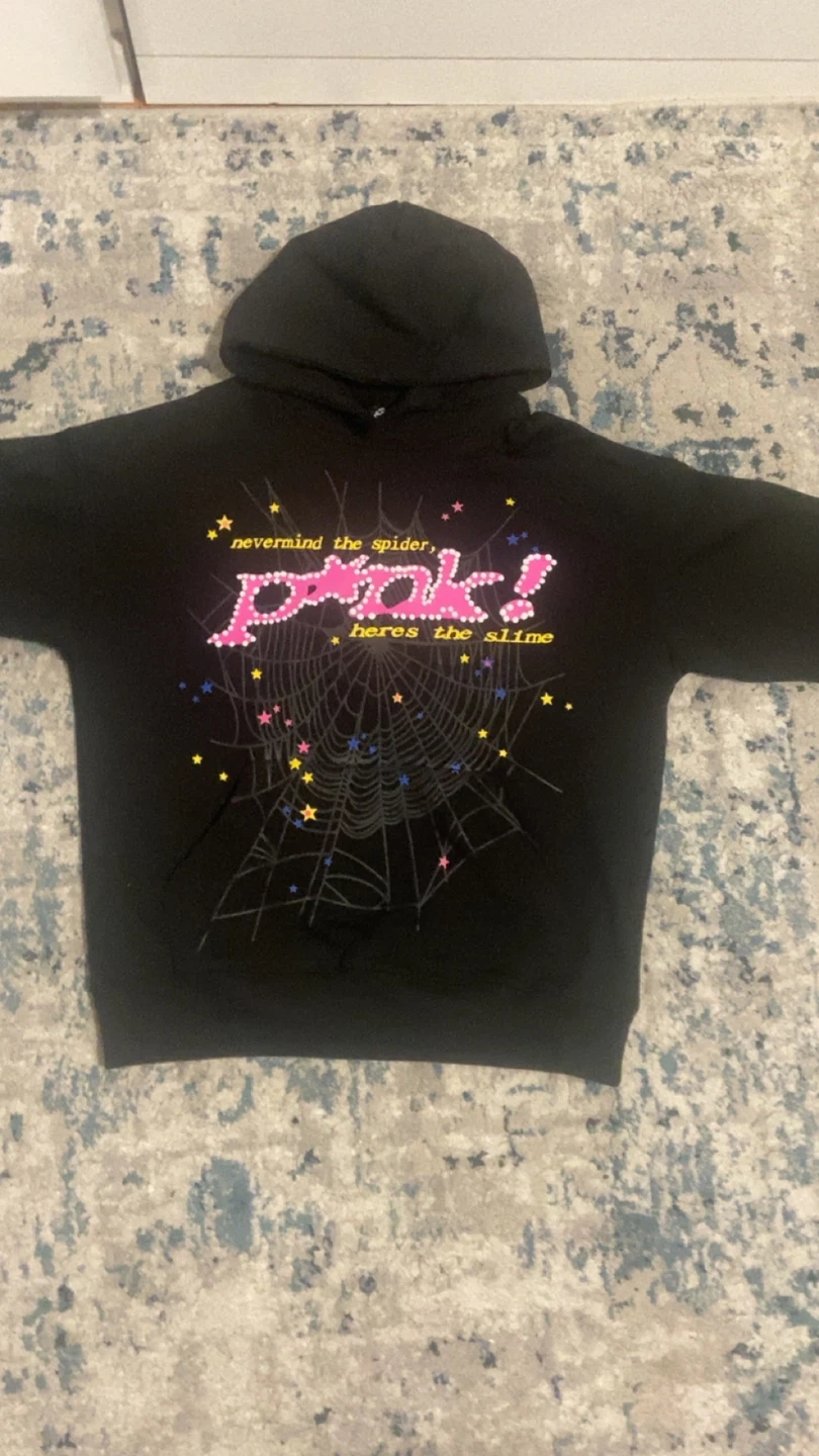 Selling a P!nk "Nevermind the Spider" black hoodie. It features a spiderweb design and the P!nk logo. The hoodie has a yellow star on the back. Perfect for any P!nk fan!