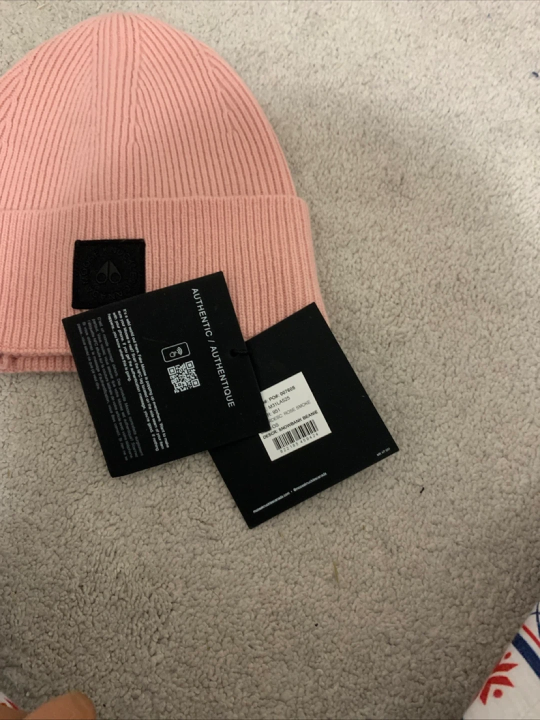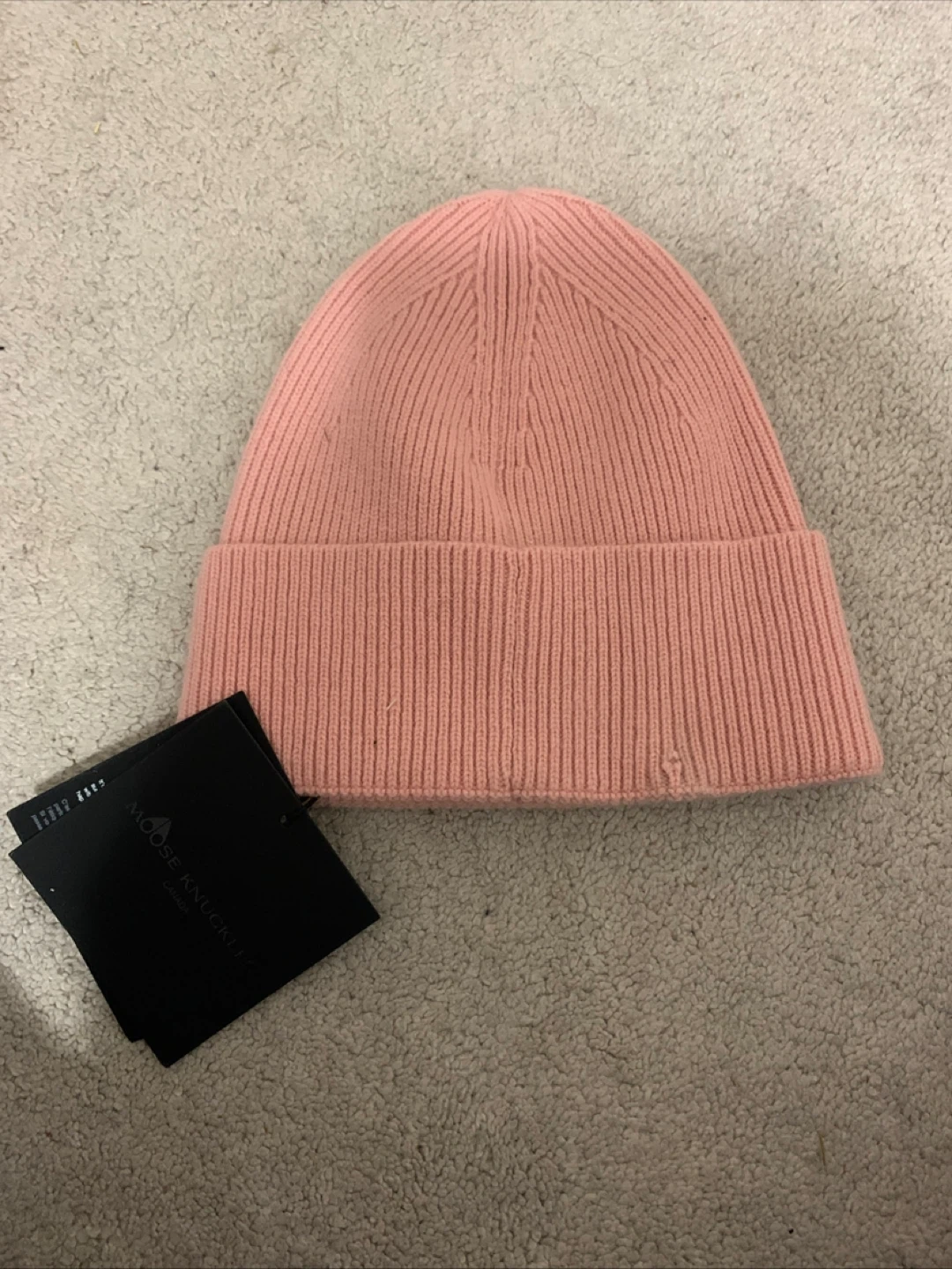 Selling a gently used Moose Knuckles beanie in a lovely rose colour! It's super cozy and stylish for those chilly days. There is a small hole near the brim, as shown in the photos.
