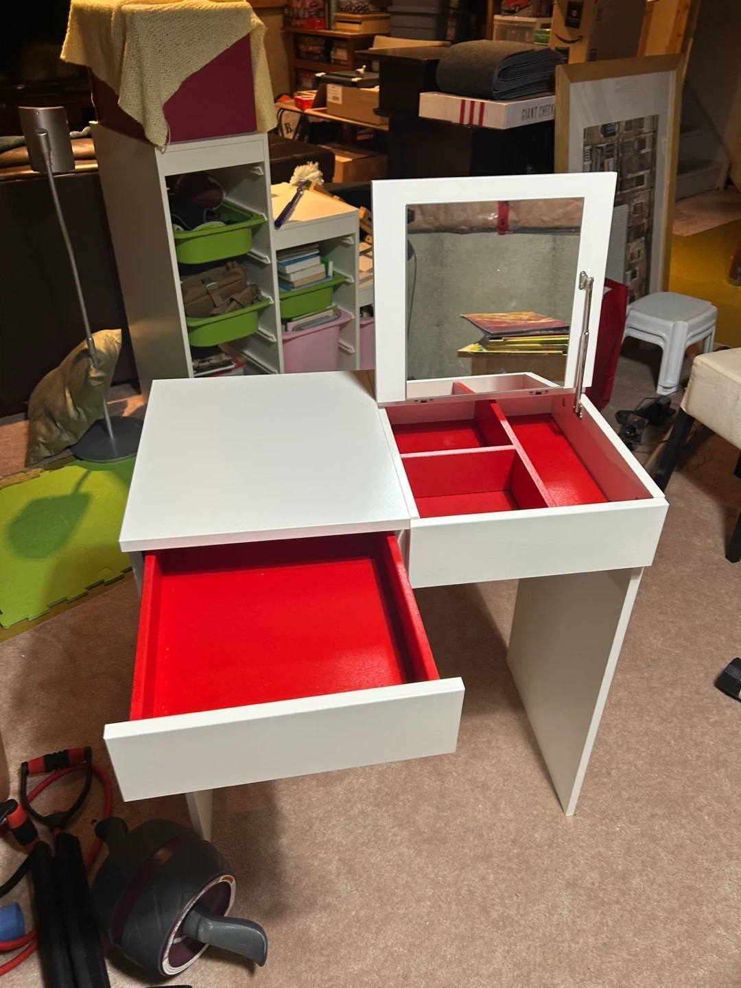 This is an Ikea Malm Dressing Table. It features a clean, white finish and a functional design. The table is used and has a red felt inside the drawers and compartments for a touch of personalized flair. Perfect for makeup and accessories, this compact vanity will fit seamlessly into any bedroom or dressing area.