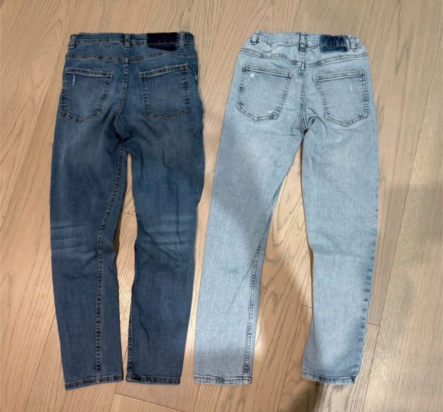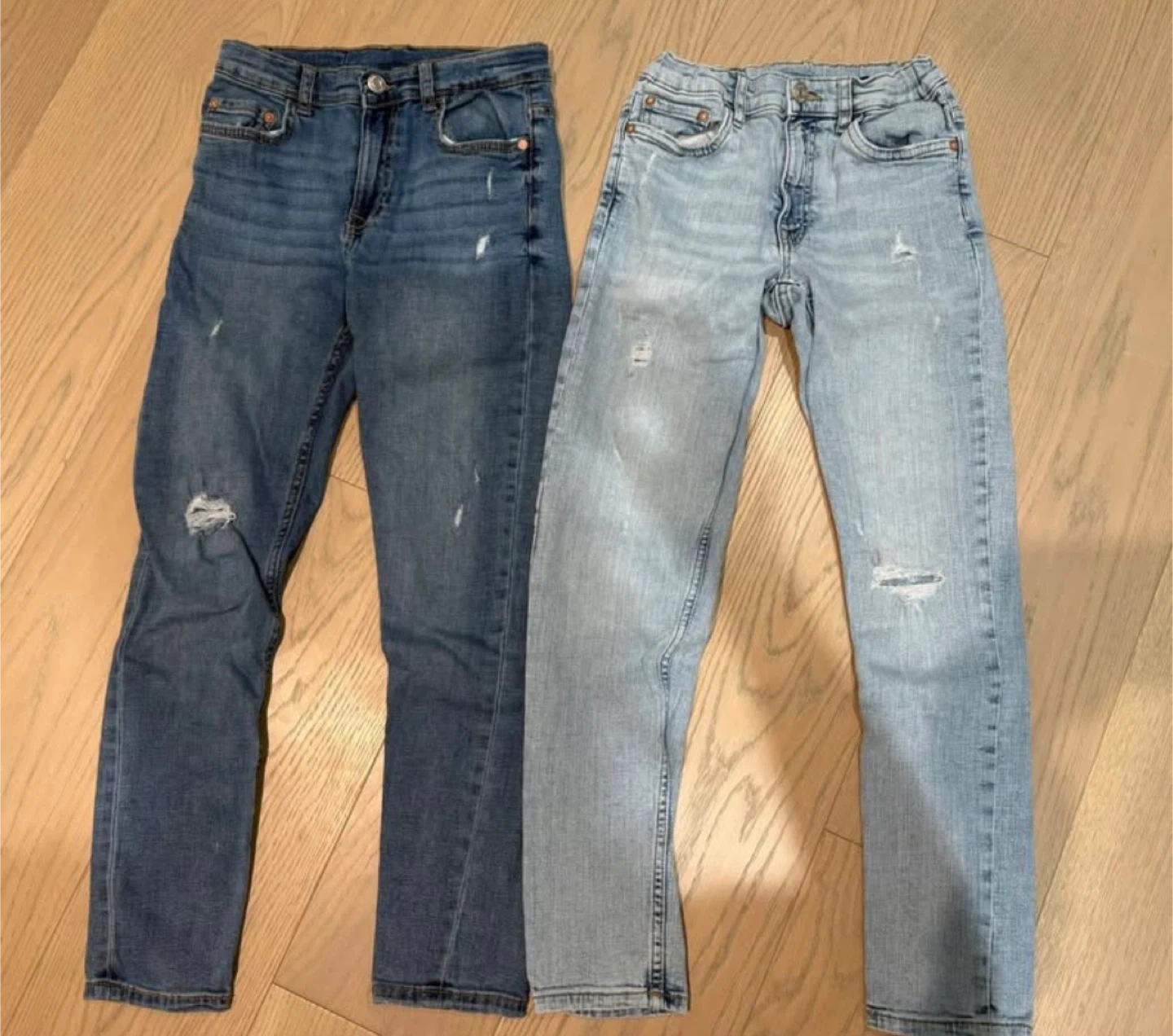 Selling two pairs of ZARA kids jeans in size 11-12. One pair is a darker wash and the other is a lighter wash. Both have some distressed detailing.