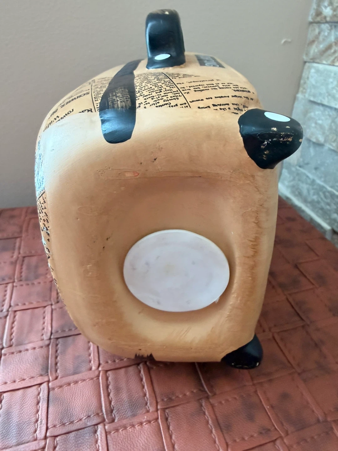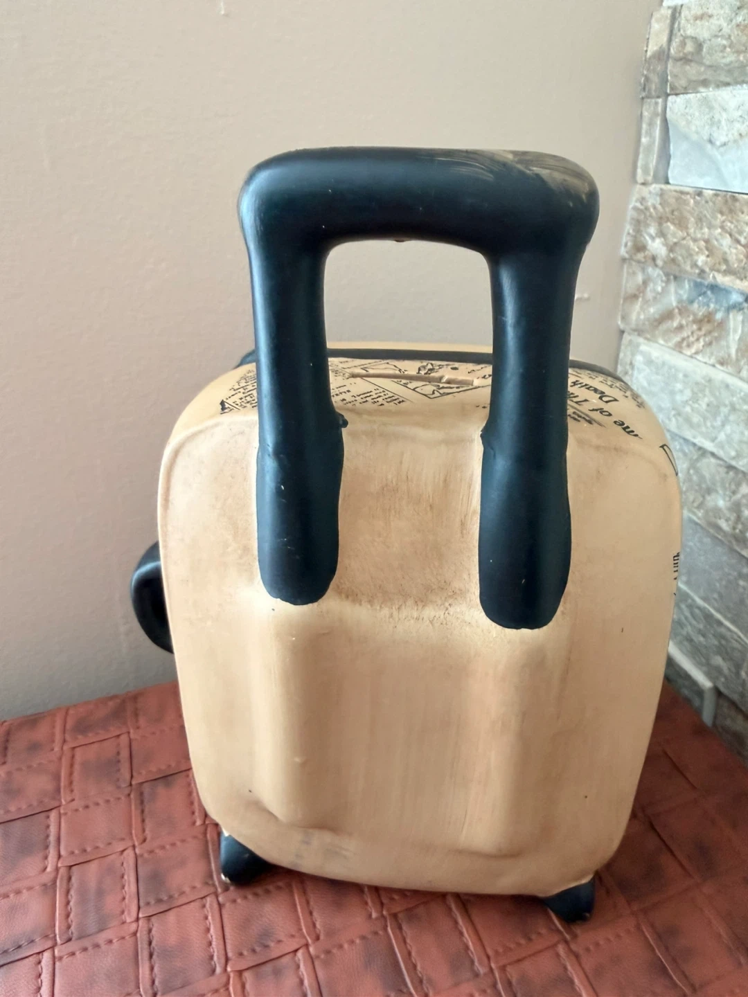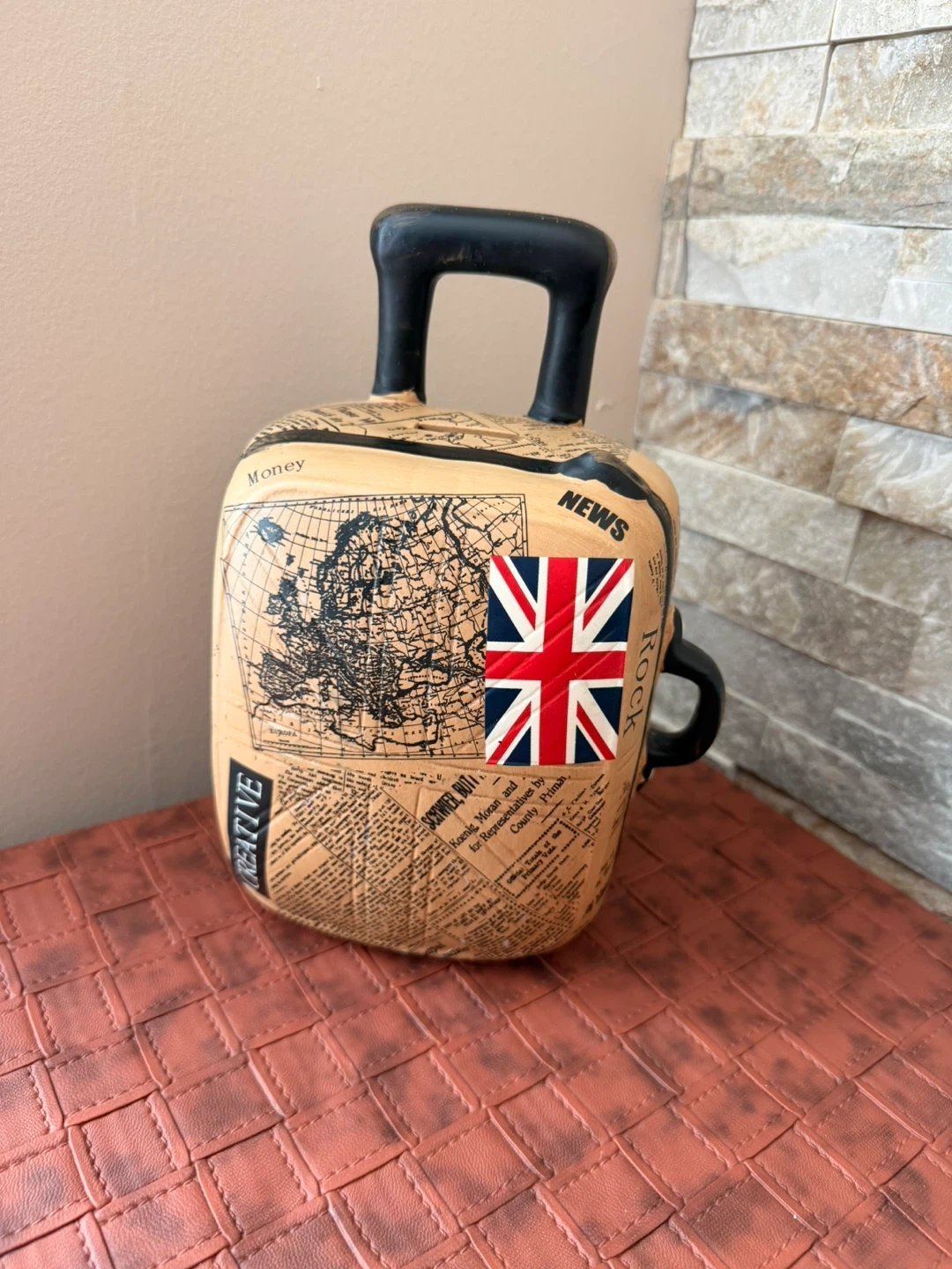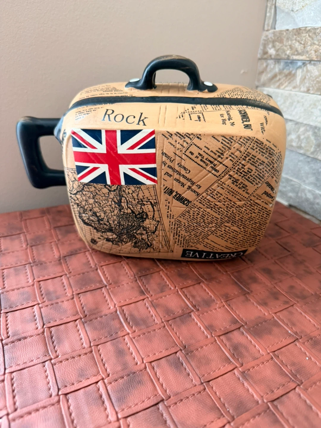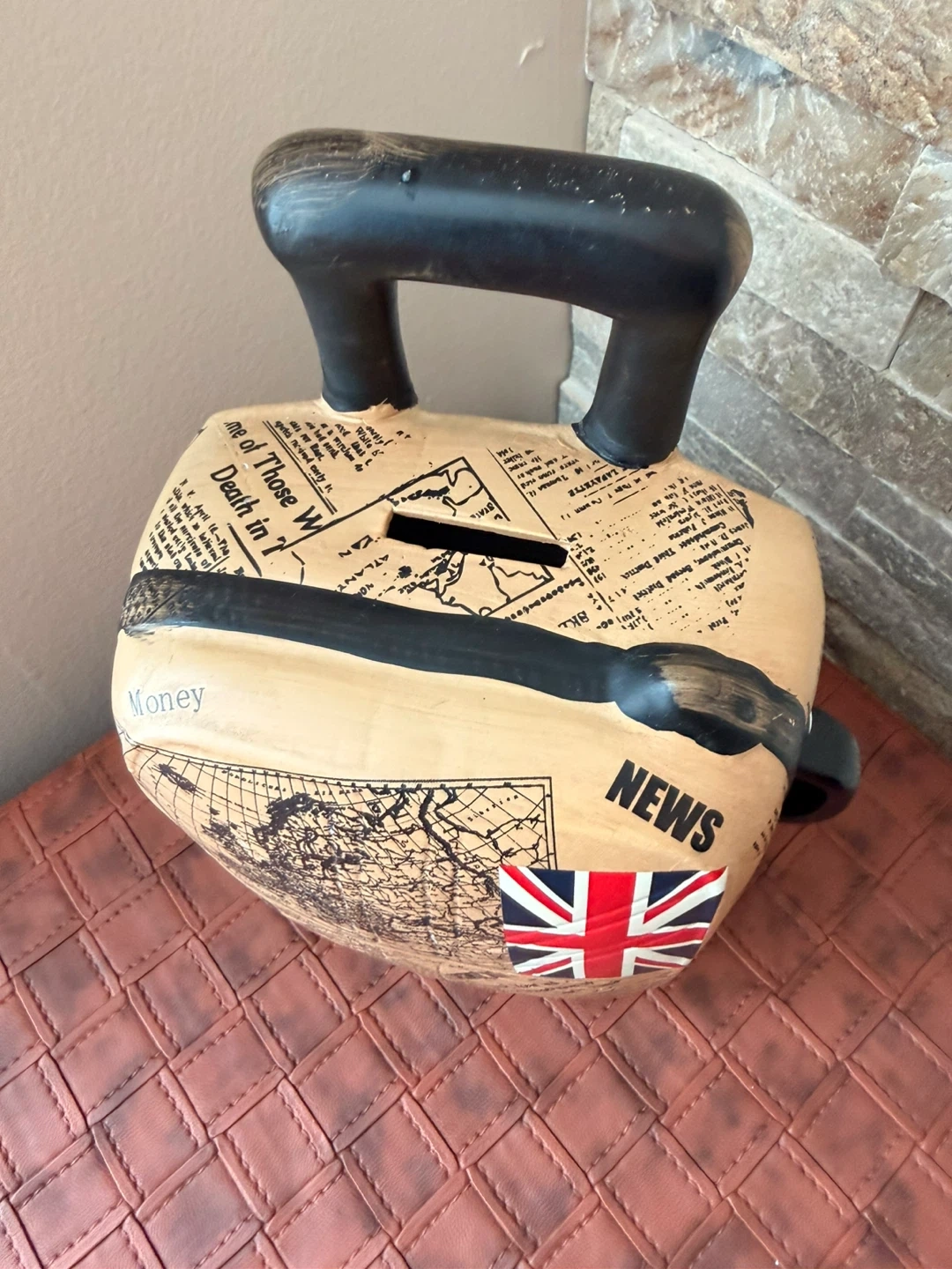 This unique piggy bank is designed to look like a vintage suitcase! It features a map design and British flag. It's perfect for adding a touch of travel-inspired decor to any room