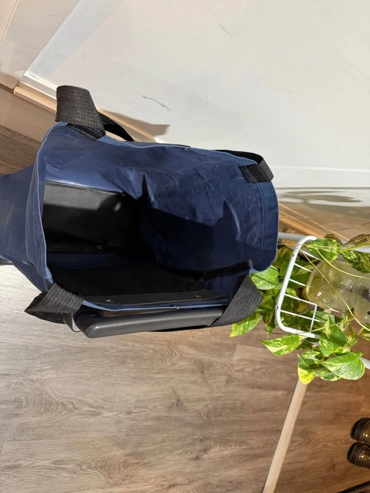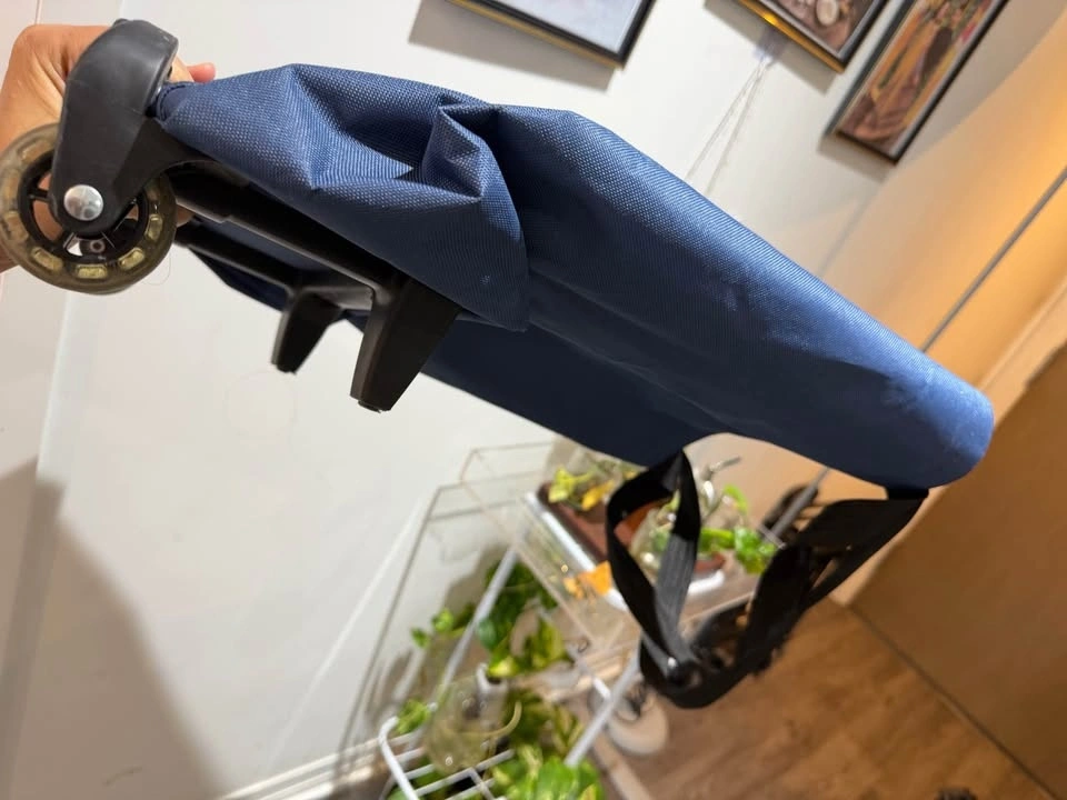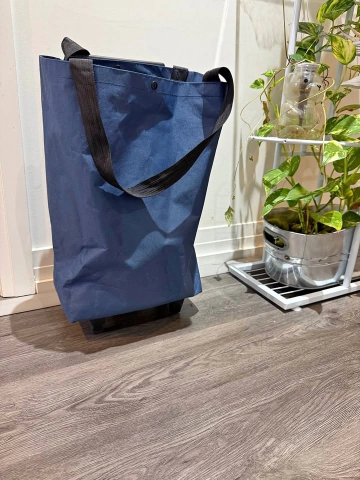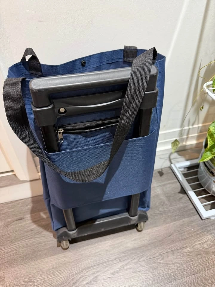Newby blue collapsible shopping/grocery trolley. Can carry upto 20kg weight. Thick non-tearing cloth. Smooth wheels. Hard plastic handle with adjustment options. Very handy for everyday groceries. No torn, no smell or defects at all. Pick up only, cash only.