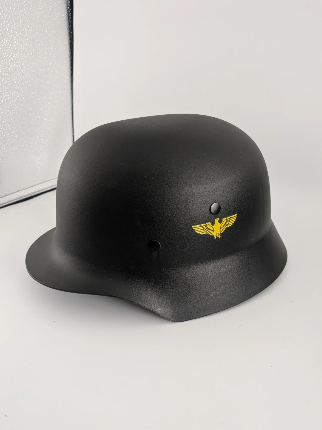 Selling a black German-style novelty helmet. It has a unique design with an eagle emblem. The helmet is new without box and has adjustable straps for a comfortable fit.