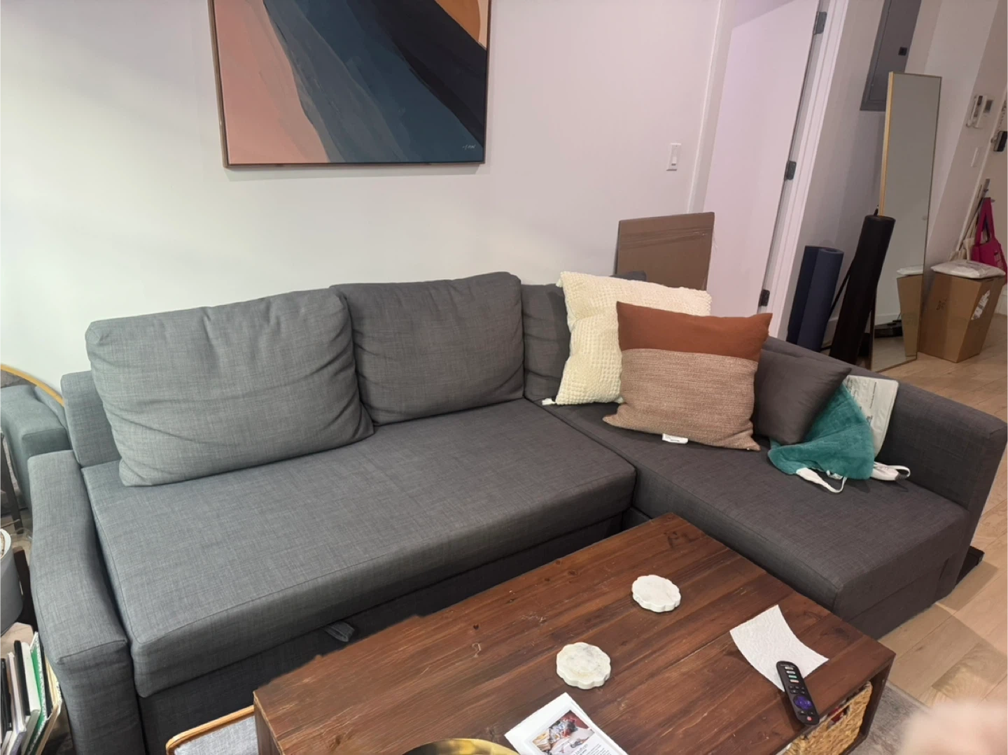 Selling used a gray IKEA Friheten sleeper sofa, originally bought in 2019. Convenient storage compartment underneath for bedding or other items. Dimensions are in the images. It comes apart into three parts for easier transportation. Available to pick up by Feb 6.
