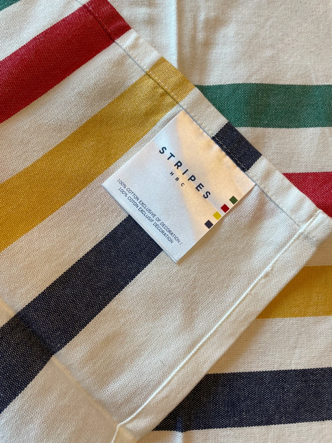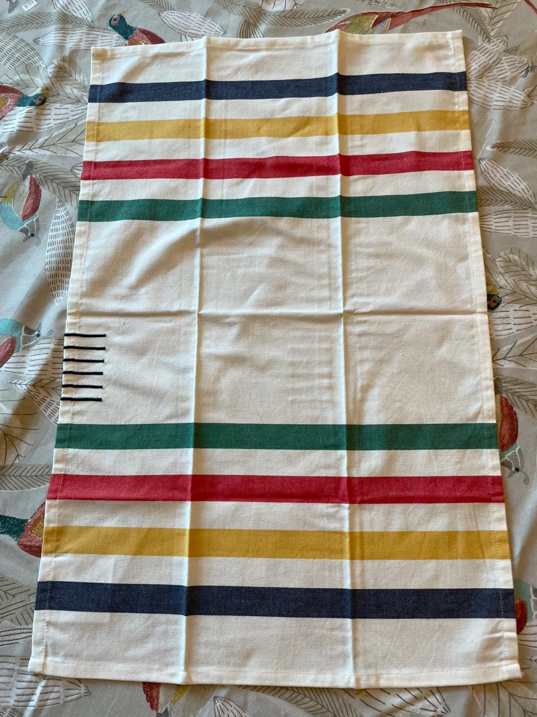 Here's a tea towel from Hudson's Bay Company (HBC)! It features the iconic HBC stripes in various colours on a white background. It's made of 100% cotton, excluding decoration. It's in great condition and ready to brighten up your kitchen.