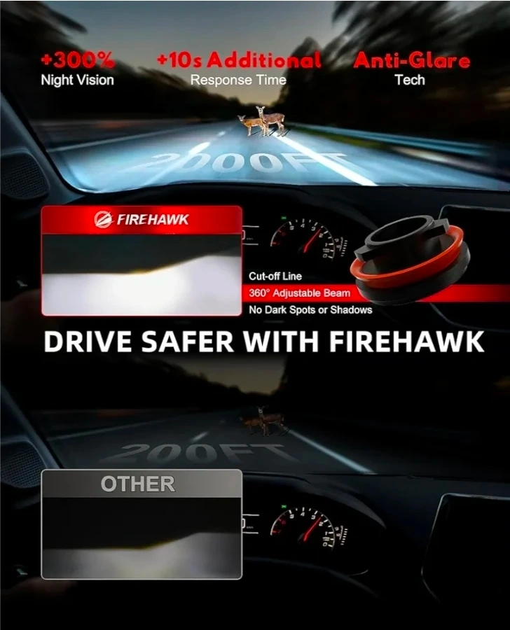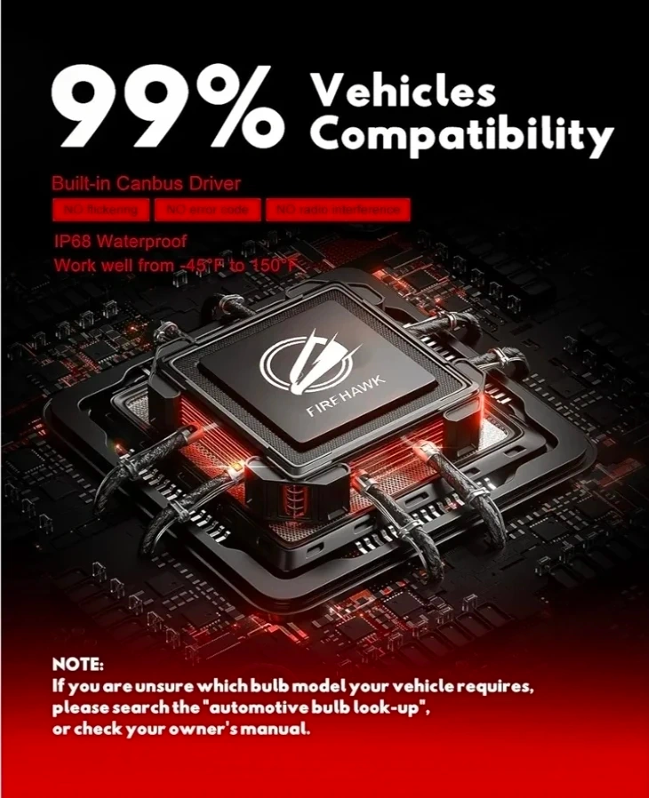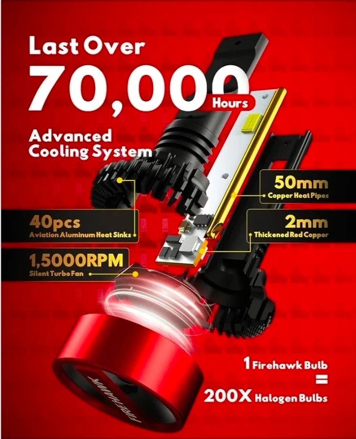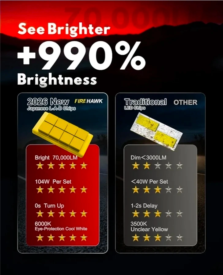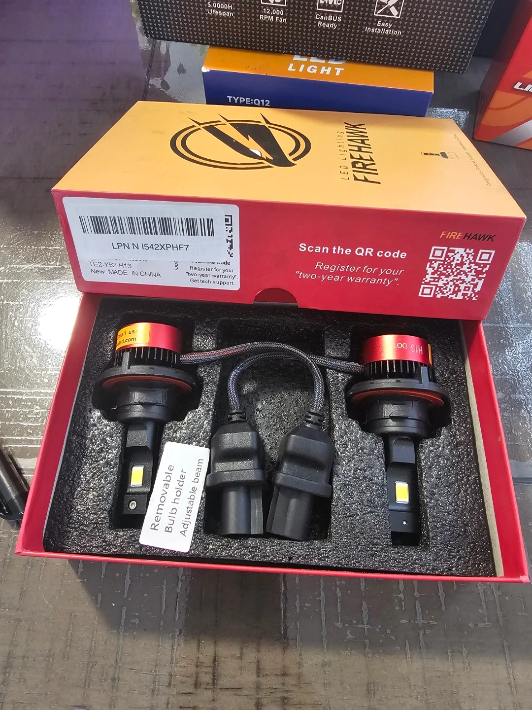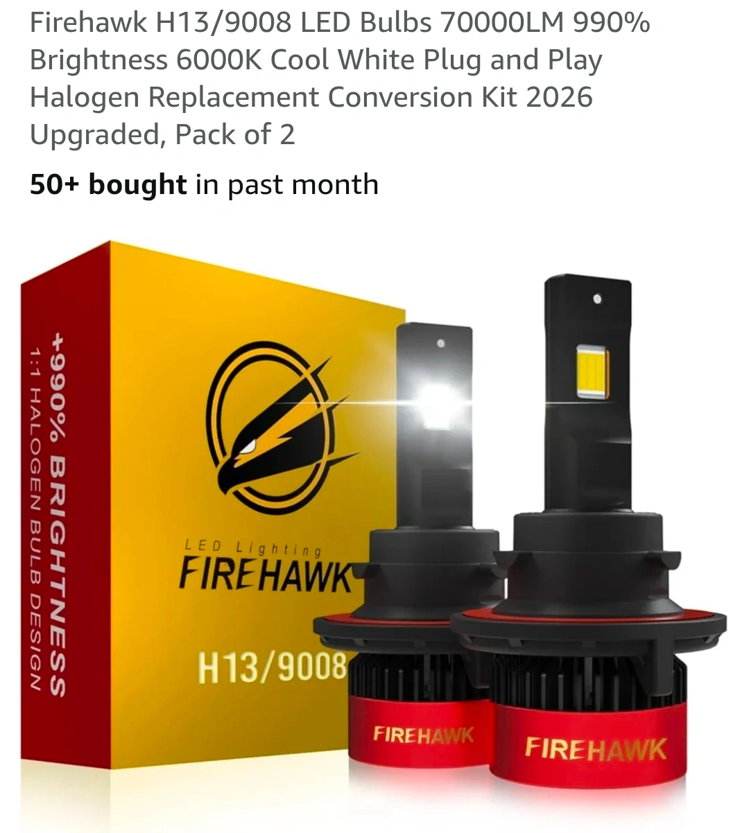 Selling a new pack of Firehawk H13/9008 LED Bulbs! These bulbs offer 70000LM brightness and 6000K cool white light. They're designed for plug and play halogen replacement and are upgraded for 2026 technology. The bulbs provide +990% brightness, ensuring a safer drive with enhanced night vision and anti-glare tech