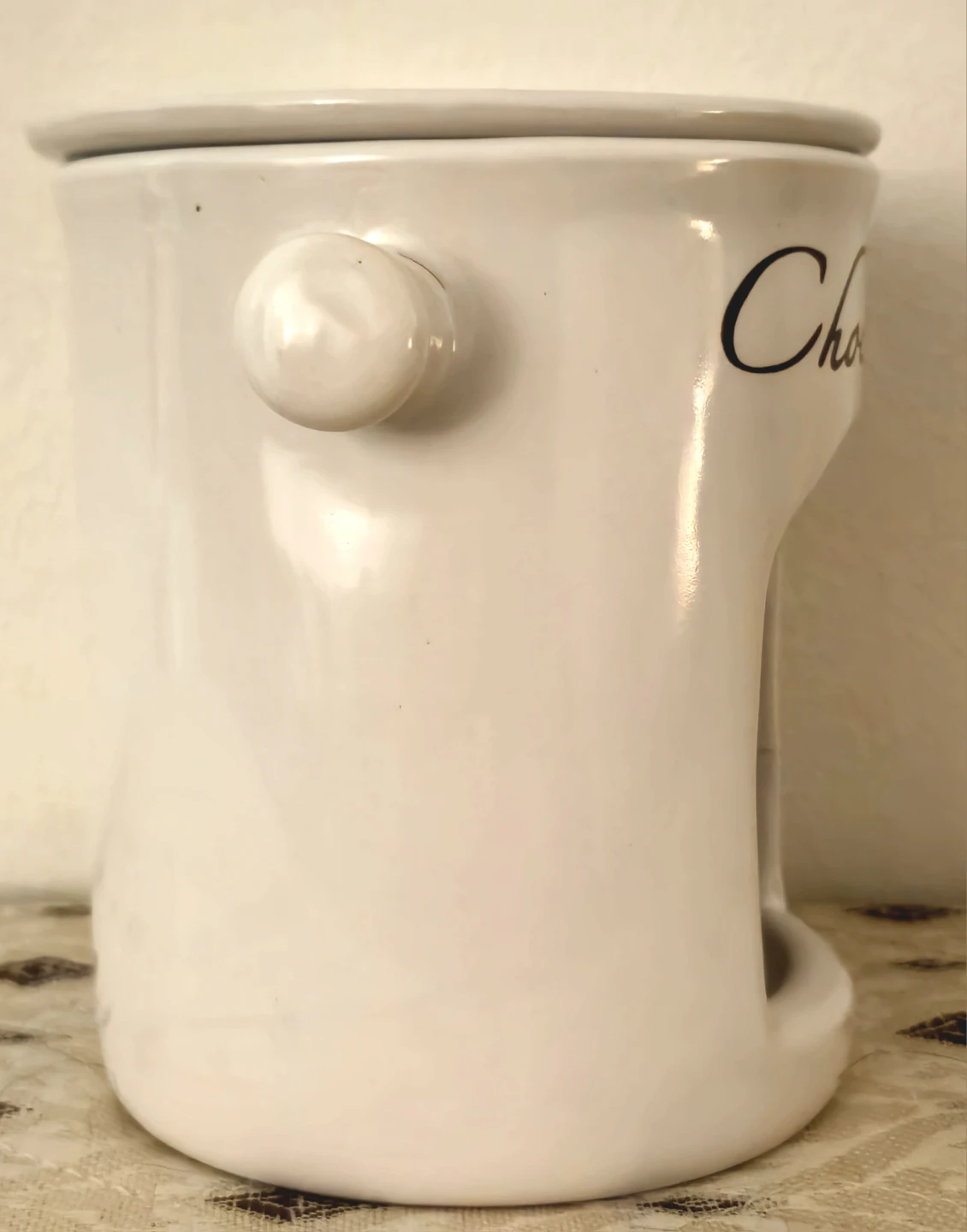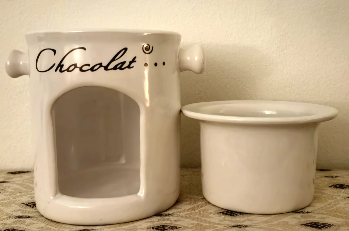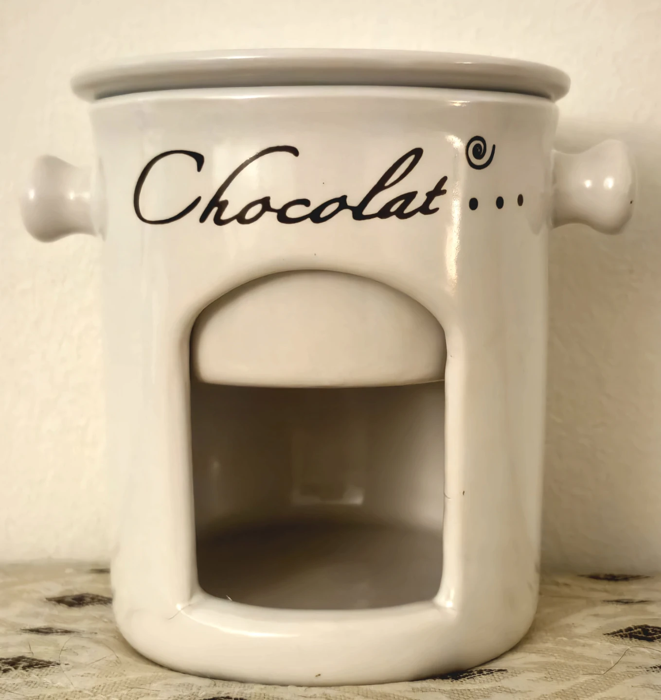 This is a charming, gently conditions, ceramic wax scent melter, perfect for adding a touch of fragrance to any room. The melter comes in a clean white colour, featuring a 'Chocolat' design, and is an elegant decorative piece. It's ideal for creating a cozy atmosphere with your favourite scented waxes.