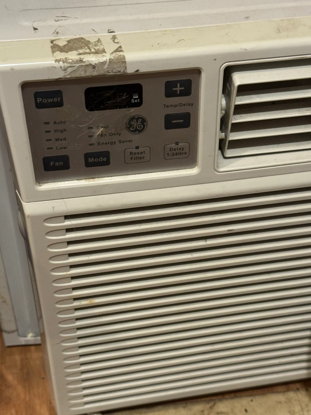 Selling a GE window air conditioner! It has multiple settings including auto, high, medium, and low. It also has an energy saver mode and a delay timer for 1-24 hours