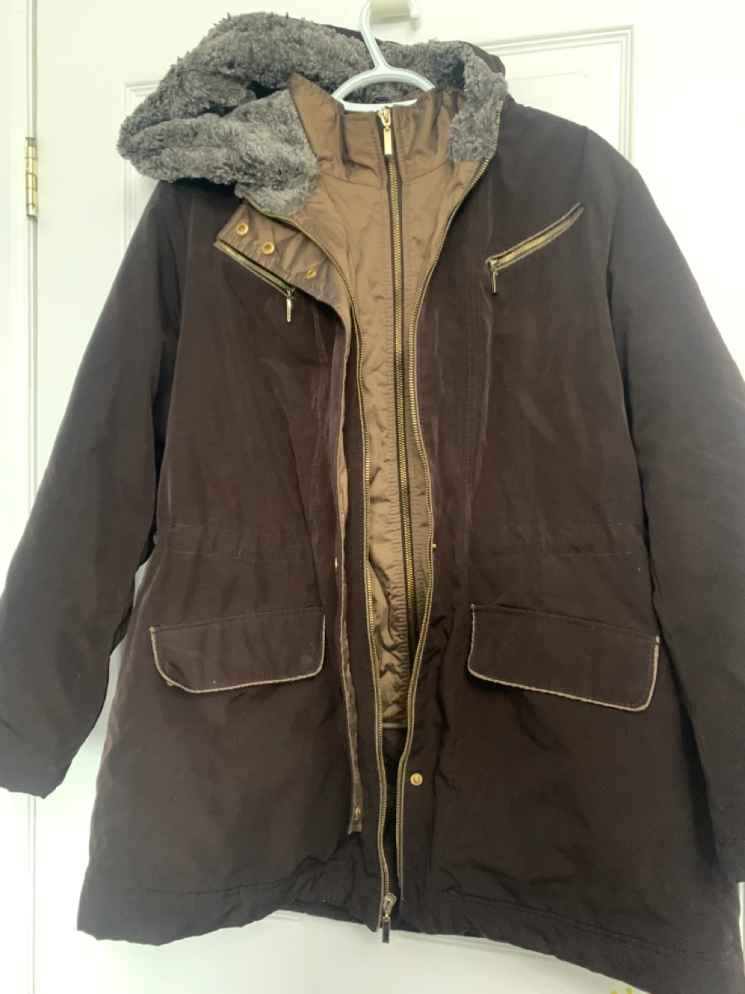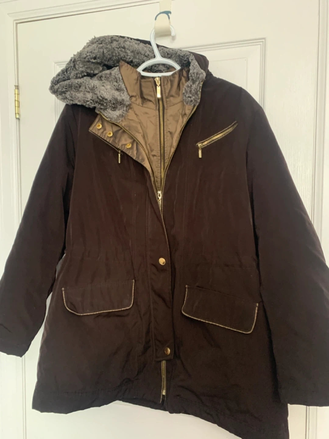 Selling a Liz Claiborne outerwear jacket in a lovely brown colour. It's size XL/TG PET. Perfect for keeping warm during the cooler months!