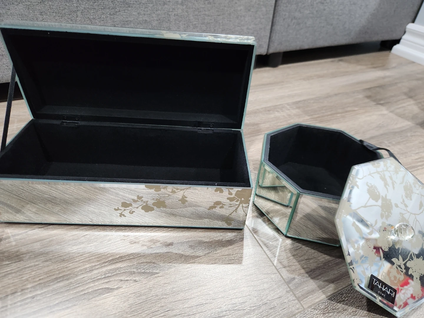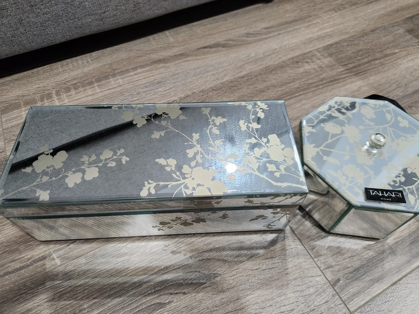 Selling two Tahari Home mirrored decor boxes. They feature a delicate floral design and would add a touch of elegance to any room. Perfect for storing jewelry, keepsakes, or other small treasures