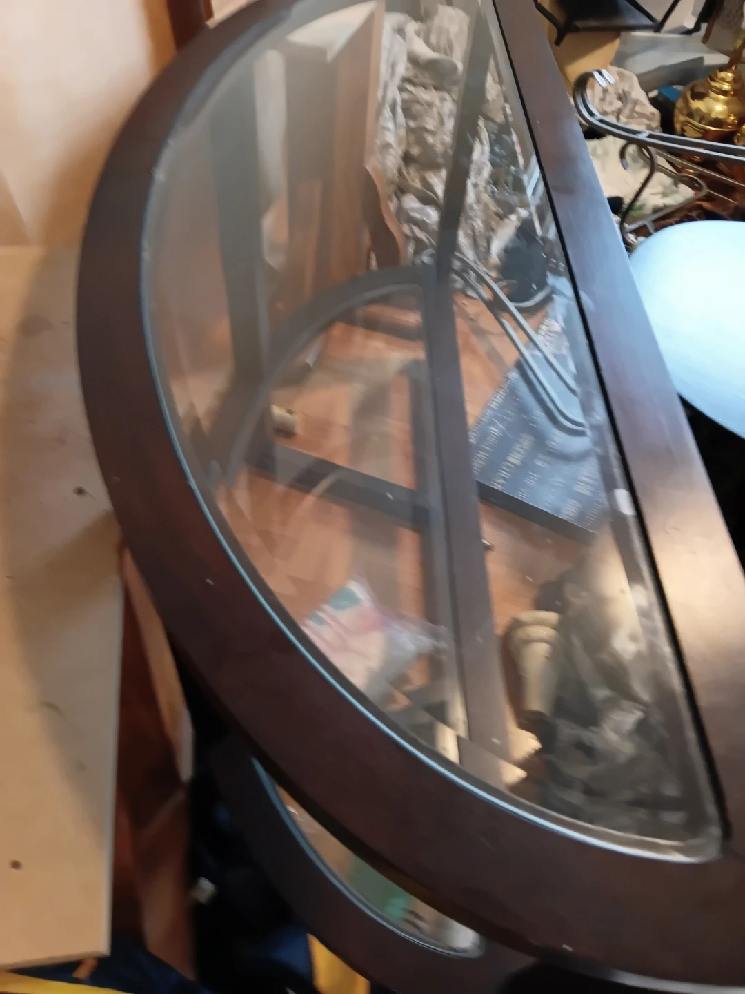 Selling a half-moon shaped table with a glass top! It has a dark brown wooden frame and would look great as an accent piece in a living room or entryway