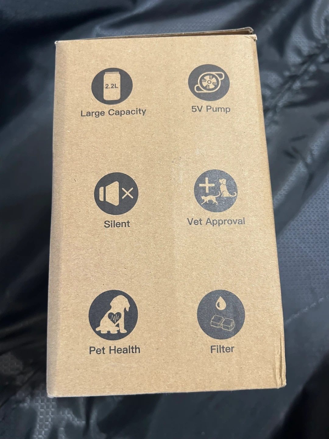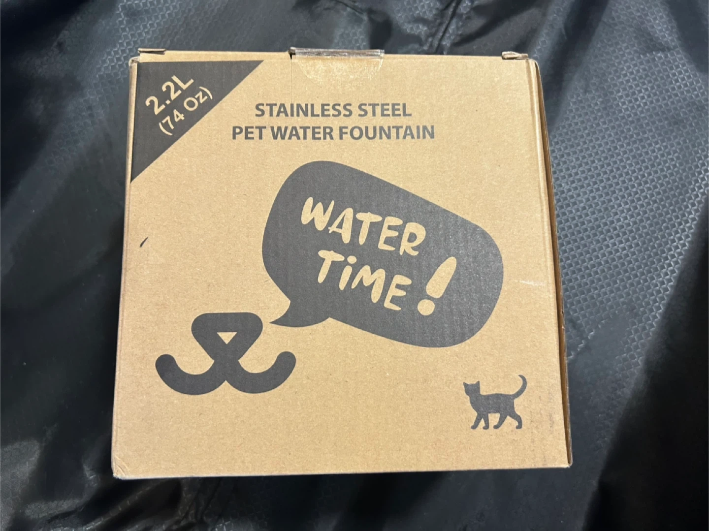 Selling a stainless steel pet water fountain. It has a large capacity of 2.2L. It features a 5V pump and is designed to be silent. It also has vet approval and promotes pet health and includes a filter.