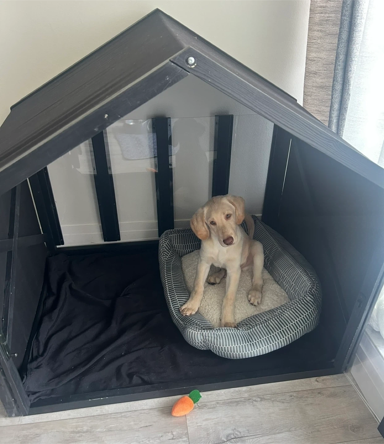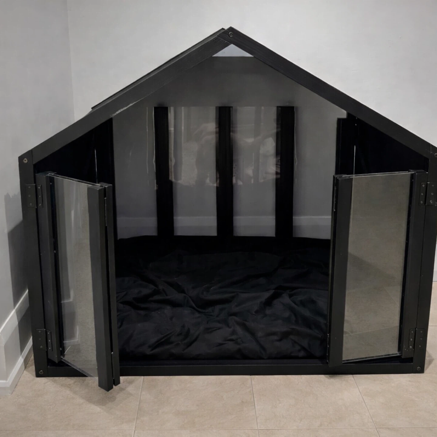 Selling a modern dog house in black with clear doors! It's a stylish and comfy space for your furry friend. The design is super sleek and would look great in any home. It's in great condition and ready for a new pup to call it home