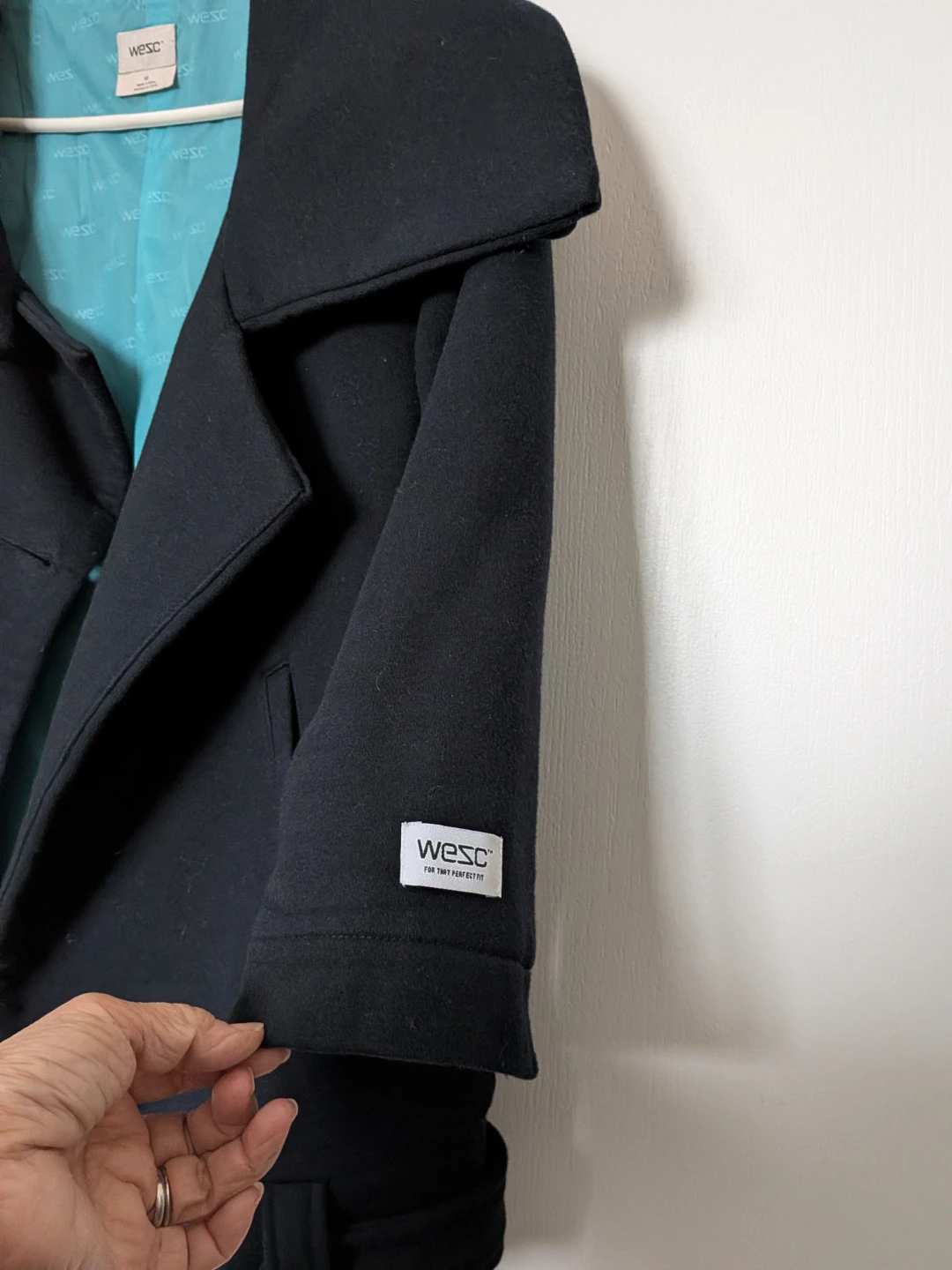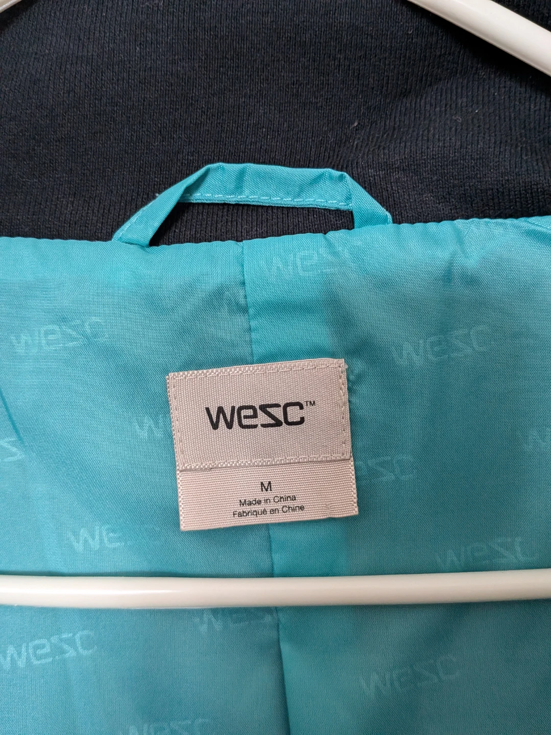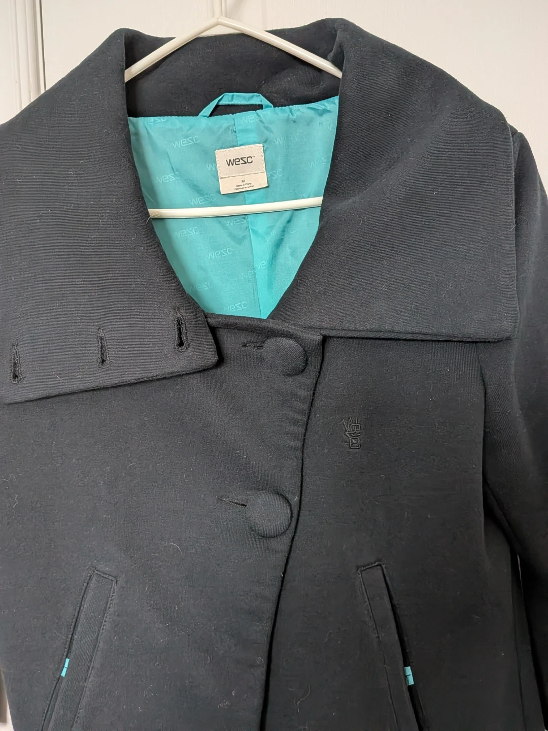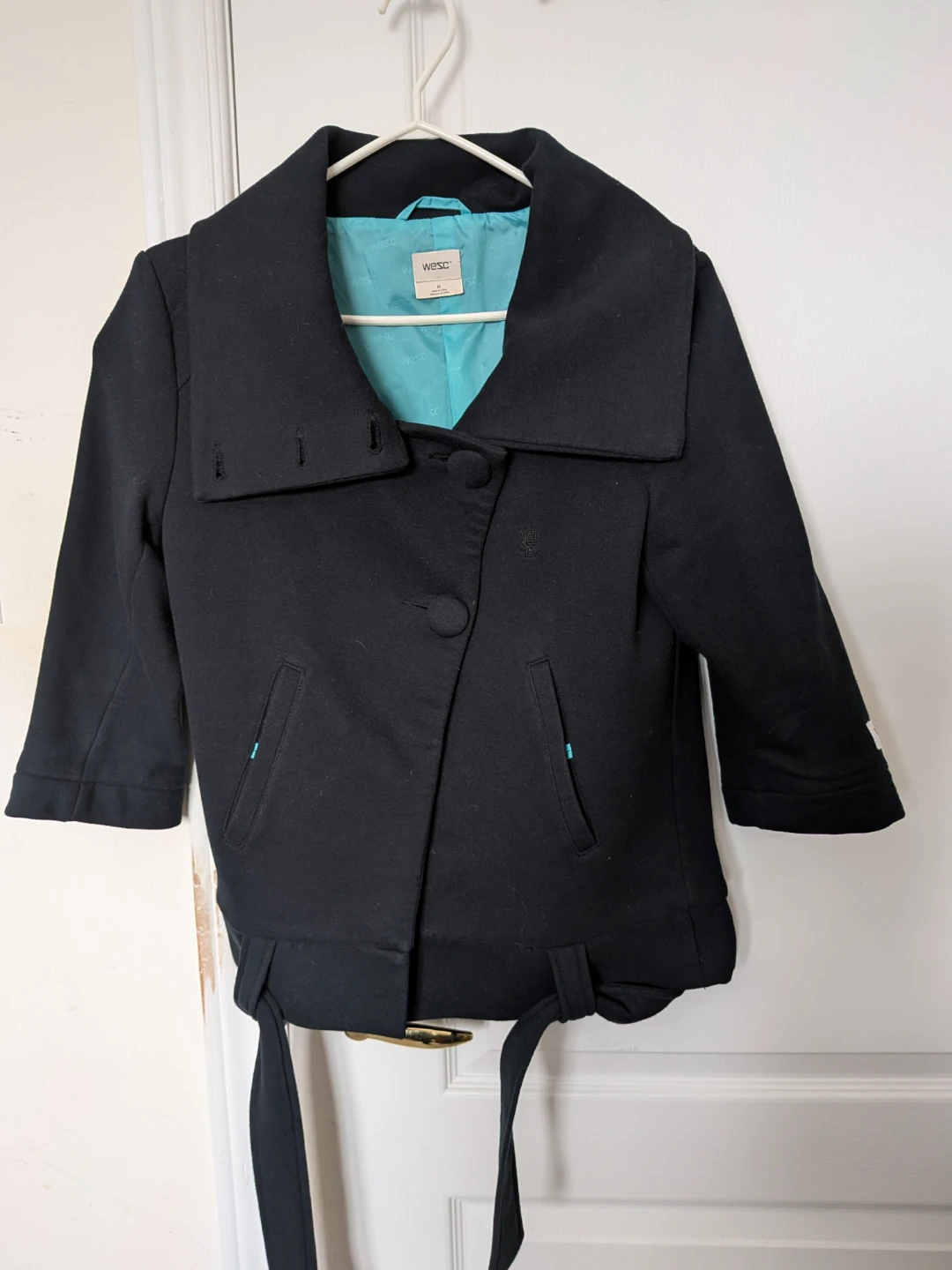 Here's a stylish WESC jacket in black! It's a size medium and features a unique design with a wide collar and belted waist. The jacket has a nice, structured look and is in great condition. Perfect for adding a touch of cool to your wardrobe!